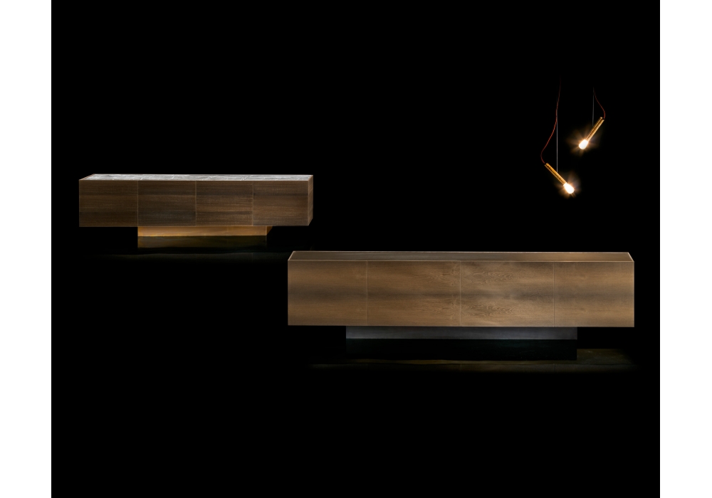 Side-X diseñado por Massimo Castagna para Henge es un aparador bajo con estructura de y puertas madera. Top de piedra o en madera en el mismo acabado que la estructura. Base en latón bruñido o acero bruñido negro. Disponible en dos tamaños.