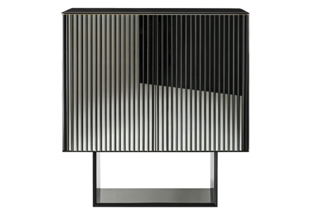 5th Avenue diseñado por Marcello Pozzi para Gallotti&Radice es un aparador revestido en acero inoxidable “superespejo” con tiras de fresno macizo de poro abierto lacado negro. Base en fresno lacado a poro abierto negro y parte interna recubierta de acero inoxidable "superespejo". Superficie con bisel en vidrio "grigio Italia" ahumado pintado de negro brillante, 12 mm, detalle de latón satinado debajo del tablero. Se suministra con estante de vidrio extraligero y vidrio espejado extraligero de 6 mm en la parte interior trasera.