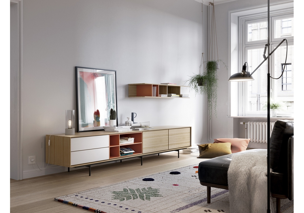 Aura diseñada por Angel Martí y Enrique Delamo para Treku es un aparador de la colección Aura. La composición sobre patas metálicas tiene una estructura de madera, con dos puertas, dos cajones y cuatro compartimentos abiertos. La unidad de pared separada está incluida.