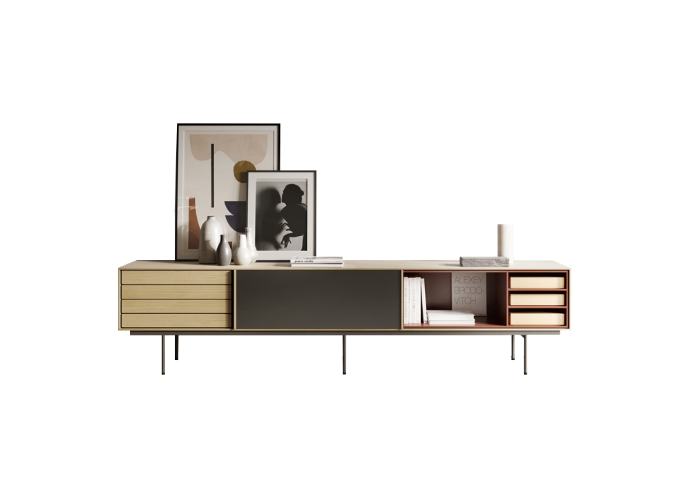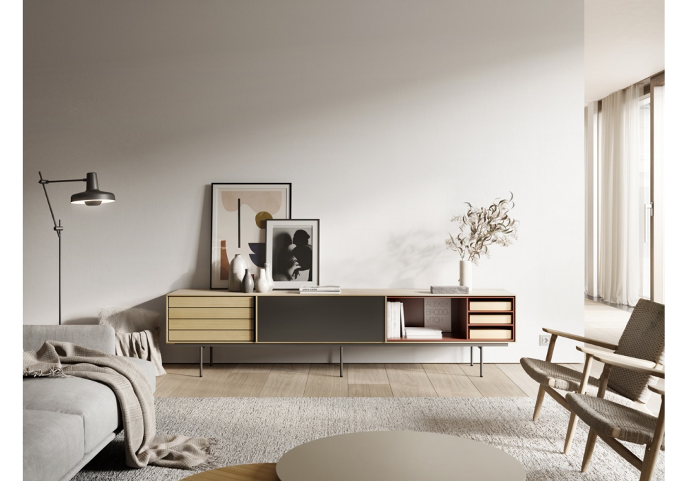 Aura diseñada por Angel Martí y Enrique Delamo para Treku es un aparador de la colección Aura. La composición tiene una estructura de madera sobre patas de metal, cajones en acabado de madera, compartimentos abiertos y puerta corredera en acabado lacado con mango de madera. Accesorios tres bandejas en tejido para el compartimento abierto.