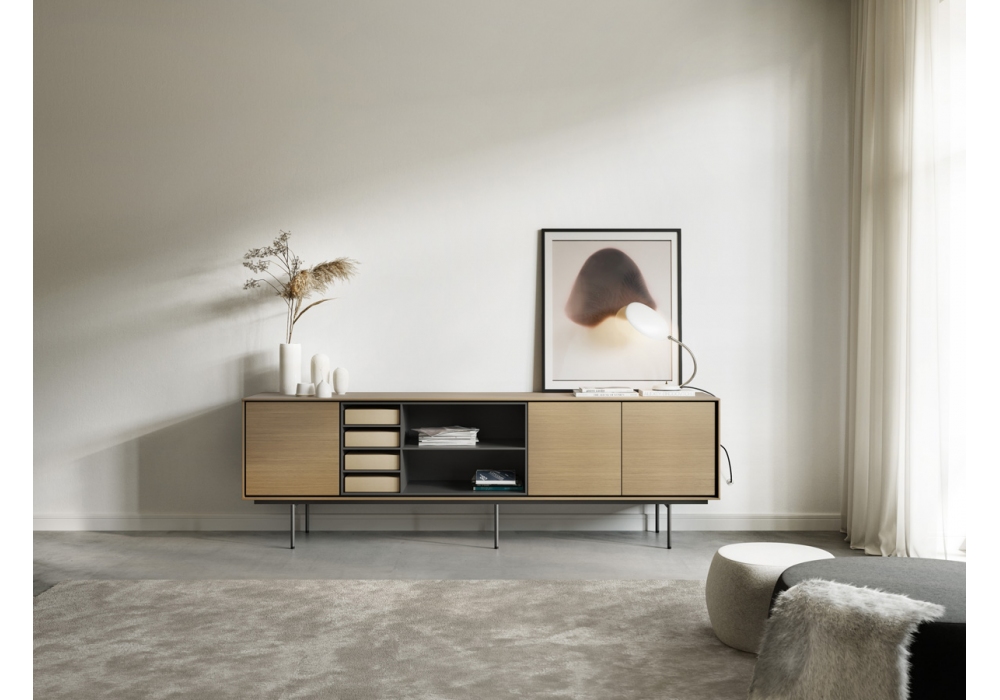 Aura diseñada por Angel Martí y Enrique Delamo para Treku es un aparador de la colección Aura. La composición tiene una estructura de madera sobre patas de metal, un compartimento abierto con acabado lacado, tres módulos con una puerta de acabado de madera. Accesorios de cuatro bandejas de tela para el compartimento abierto.