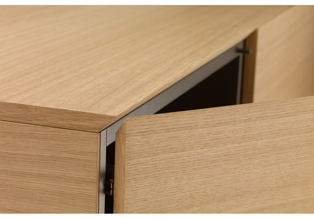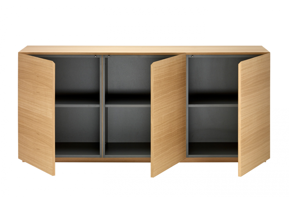 1890 diseñado por Thonet Design Team: Emilia Becker para Thonet es un aparador en madera, disponible en haya teñida, fresno, roble o nogal. Estantes internos en gris grafito. También disponible en 3 medidas con 2, 3 o 4 puertas.