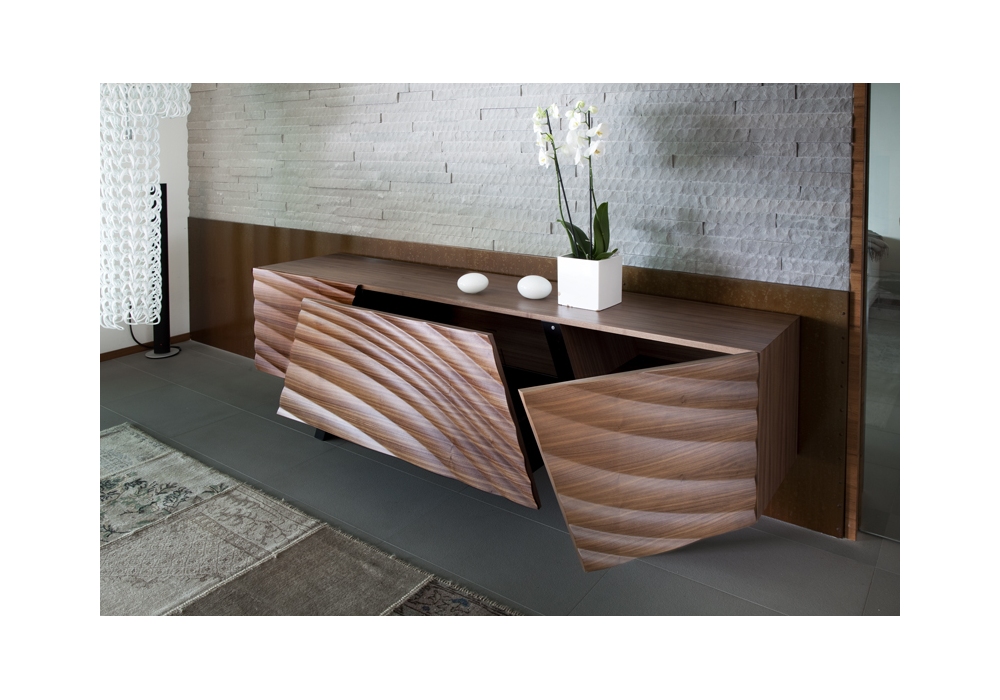 Move Wood diseñado por Mac Stopa para Tonon es un aparador con estructura en madera contrachapada (roble, nogal canaletto y lacada) y superficie frontal en mdf tridimensional contrachapado en roble o nogal canaletto. Patas en haya maciza lacada en blanco o negro.