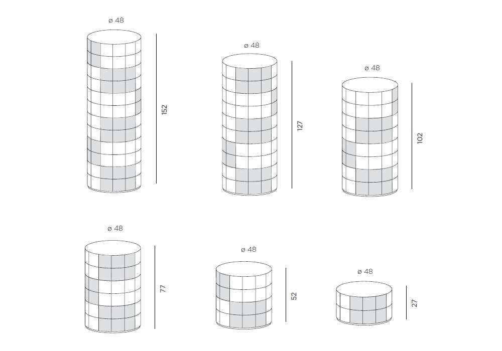 | Dimensiones | Ø 48 x H 152 cm; Ø 48 x H 127 cm; Ø 48 x H 102 cm; Ø 48 x H 77 cm; Ø 48 x H 52 cm; Ø 48 x H 27 cm |