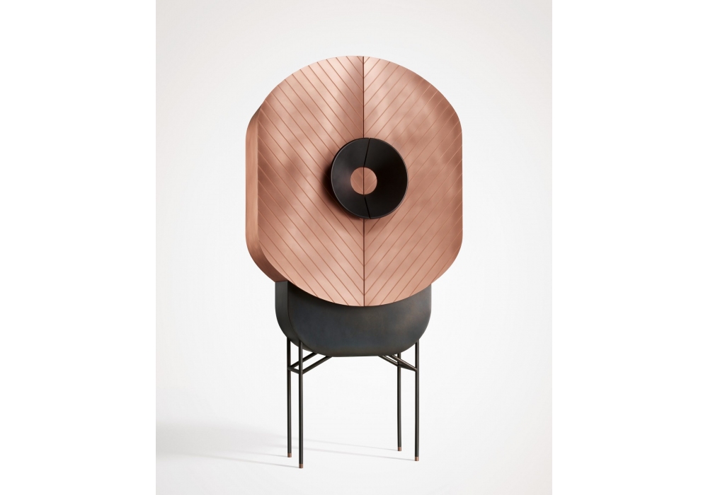 Polifemo diseñado por Elena Salmistraro para DeCastelli es un mueble contenedor con dos puertas batientes cubiertas de metal por todos los lados, completo con fijación a pared.