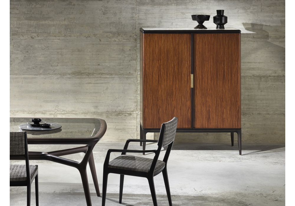 Oblique diseñado por DRAW para Ceccotti Collezioni es un mueble contenedor con estructura y base en nogal americano macizo. Puertas, laterales y frentes de cajónes en palisandro, ébano, piel o lacado mate. Interior de mueble contenedor con n°2 estantes de vidrio transparente. Superficie en nogal, mármol o vidrio lacado. *Especificar el código de color RAL para los acabados de laca.