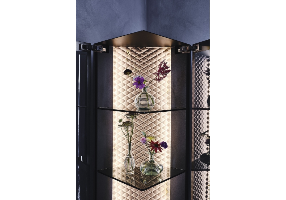Atelier diseñada por Alberto Danese para Cattelan Italia es una vitrina con iluminación Led. Estantes interiores en cristal fumè. Estructura y patas en acero barnizado gofrado negro, puertas y laterales en cristal fumè con bandas en cristal barnizado negro. Sobre y fondo en cristal barnizado negro translúcido, respaldo interior en ecopiel o piel acolchada.