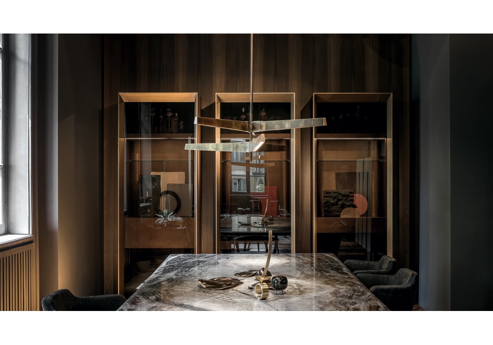 Loom FR diseñado por Massimo Castagna para Henge es una vitrina con carcasa en madera maciza. Puerta batiente en vidrio Stopol con marco de latón o acero. Respaldo y contenedor (donde esté provisto) en metal. Estantes en vidrio templado bronceado. Disponible en tres diferentes modelos. Iluminación LED disponible bajo pedido.