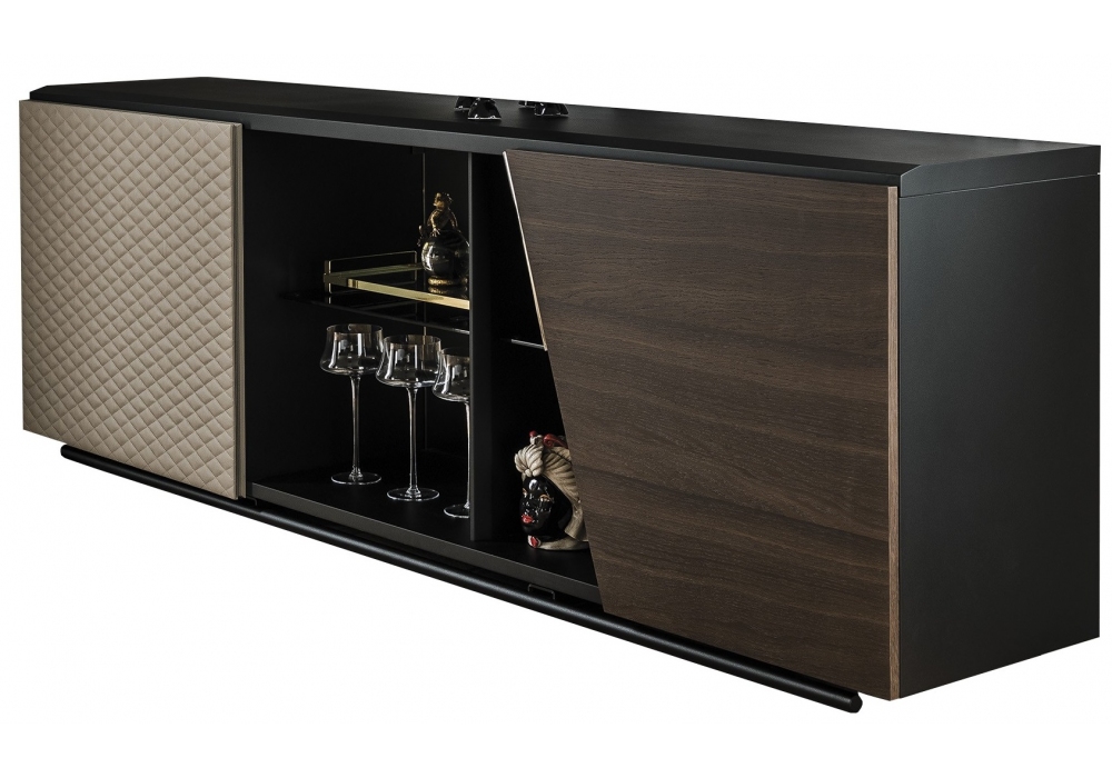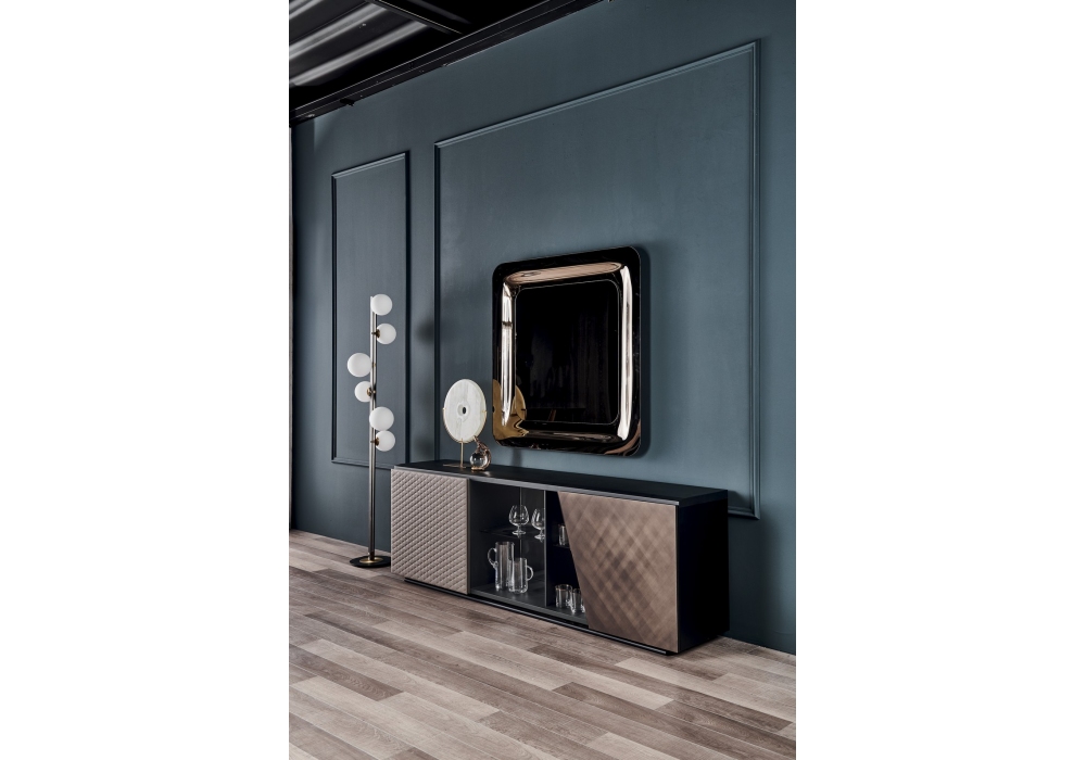 Aston diseñado por STC Studio para Cattelan Italia es un aparador con estructura de madera lacada gofrada y base de acero. Puerta izquierda con revestimiento acolchado en piel o ecopiel, mueble central con espejo, puerta derecha en madera con detalles en cromo negro. Estantes internos en vidrio ahumado.