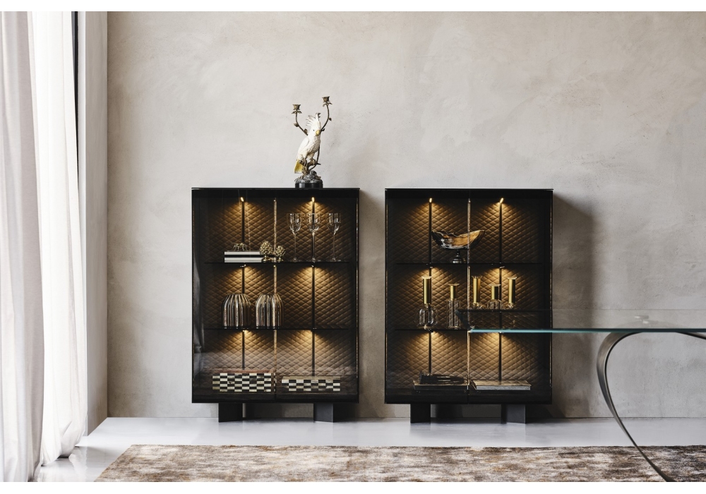Boutique Alta diseñada por Alberto Danese para Cattelan Italia es un aparador alto con iluminación LED. Estructura y pies en acero barnizado gofrado negro, sobre e fondo en vidrio lacado negro. Laterales y puertas en vidrio ahumado con franjas en vidrio lacado negro. Respaldo interior con revestimiento acolchado en piel o ecopiel. Estante interno en vidrio ahumado.