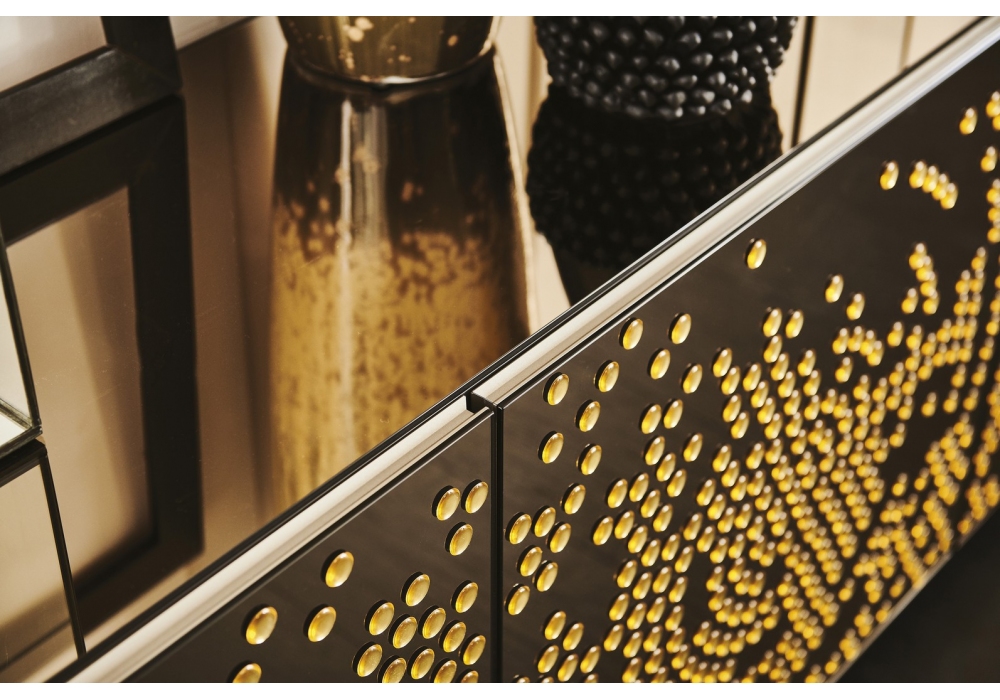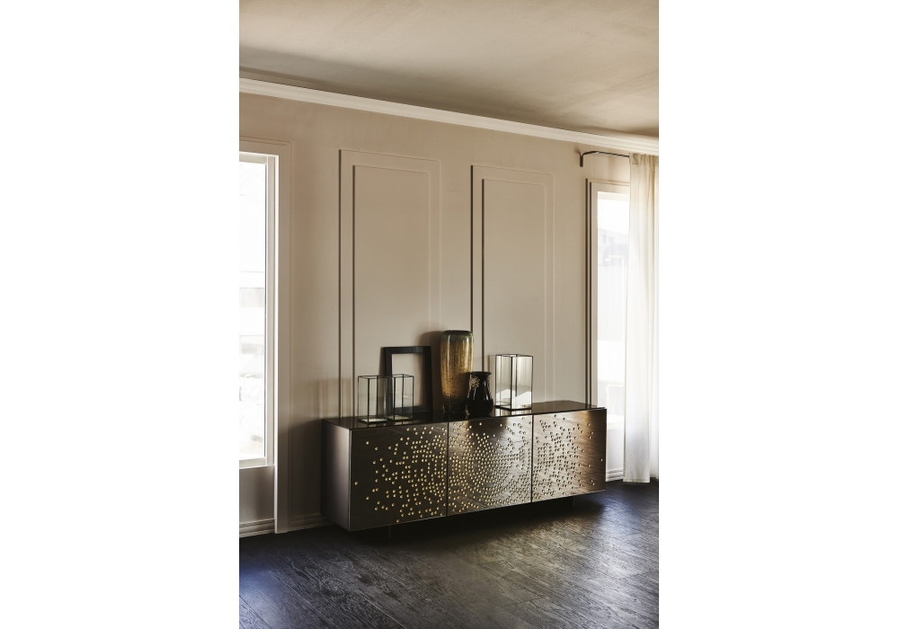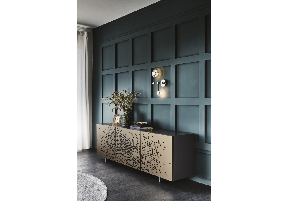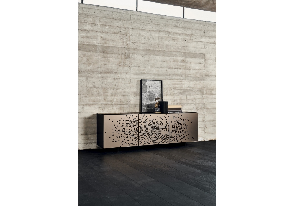 Voyager diseñado por Lorenzo Remedi para Cattelan Italia es un aparador con estructura en madera lacada, sobre en vidrio bronce espejado extraclaro o en el mismo acabado de la estructura. Puertas en vidrio esmerilado espejado en bronce con adornos en relieve en negro brillante o en vidrio espejado en bronce con adornos en relieve en color dorado. Perfiles en aluminio titanio gofrado. Estantes internos en vidrio transparente. Disponible en cuatro tamaños.