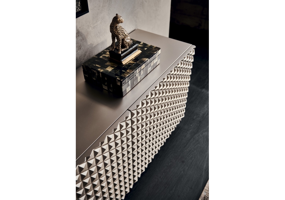 Royalton diseñado por Philip Jackson para Cattelan Italia es un aparador realizado con estructura de madera y puertas en poliuretano lacado en titanio. Pies en acero inoxidable pulido o acero barnizado gofrado. Estantes internos en vidrio transparente. Disponible en cuatro tamaños.