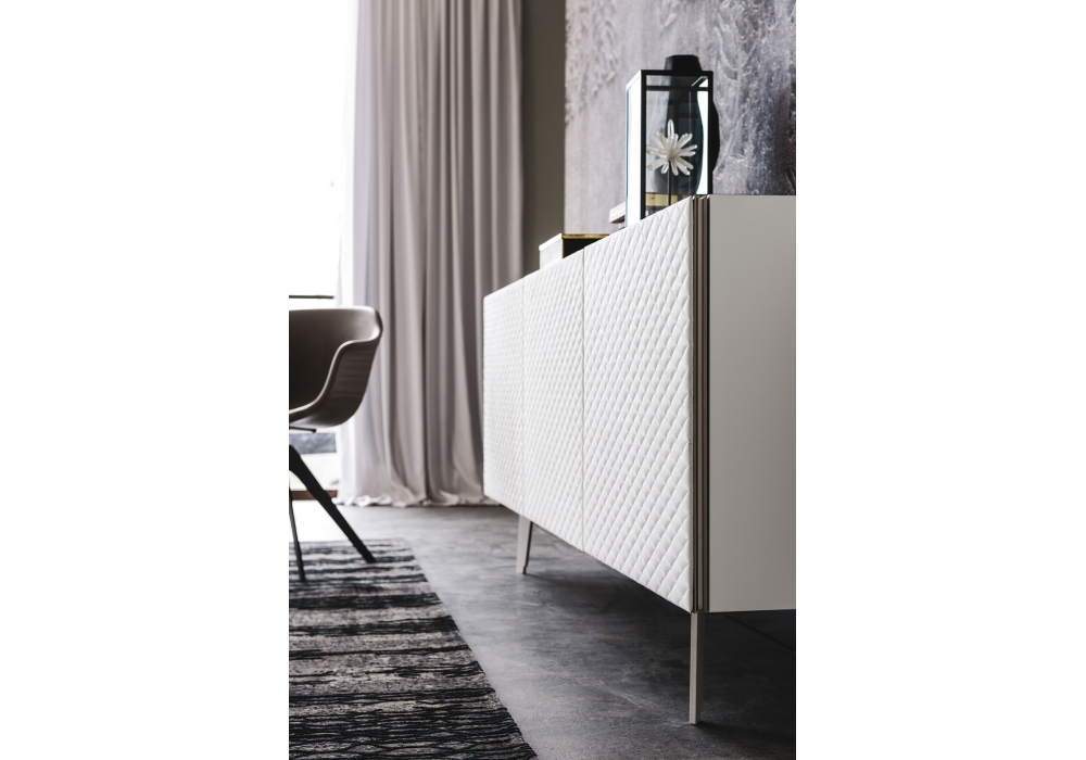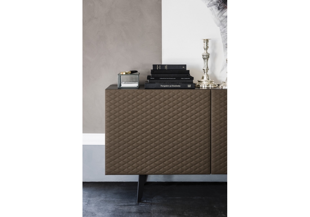 Absolut diseñado por Paolo Cattelan para Cattelan Italia es un aparador realizado con estructura de madera lacada y base en acero barnizado del mismo color de la estructura. Puertas con revestimiento acolchado en ecopiel o piel. Estantes internos en vidrio transparente. Disponible con sobre en cristal extraclaro barnizado pintado blanco, graphite o negro o en cristal reflejado bronce.