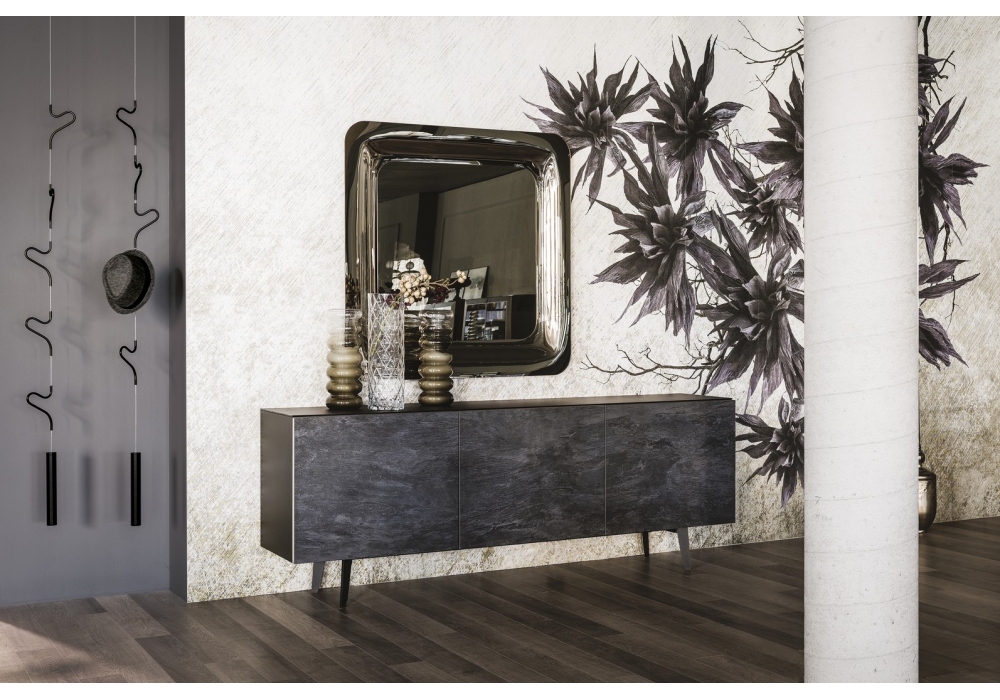 Metropol diseñado por Paolo Cattelan para Cattelan Italia es un aparador realizado con estructura de madera lacada y base en acero barnizado del mismo color de la estructura. Puertas en cerámica Marmi en varios colores. Estantes internos en vidrio transparente. Disponible con sobre en cristal extraclaro barnizado pintado blanco, graphite o negro o en cristal reflejado bronce.