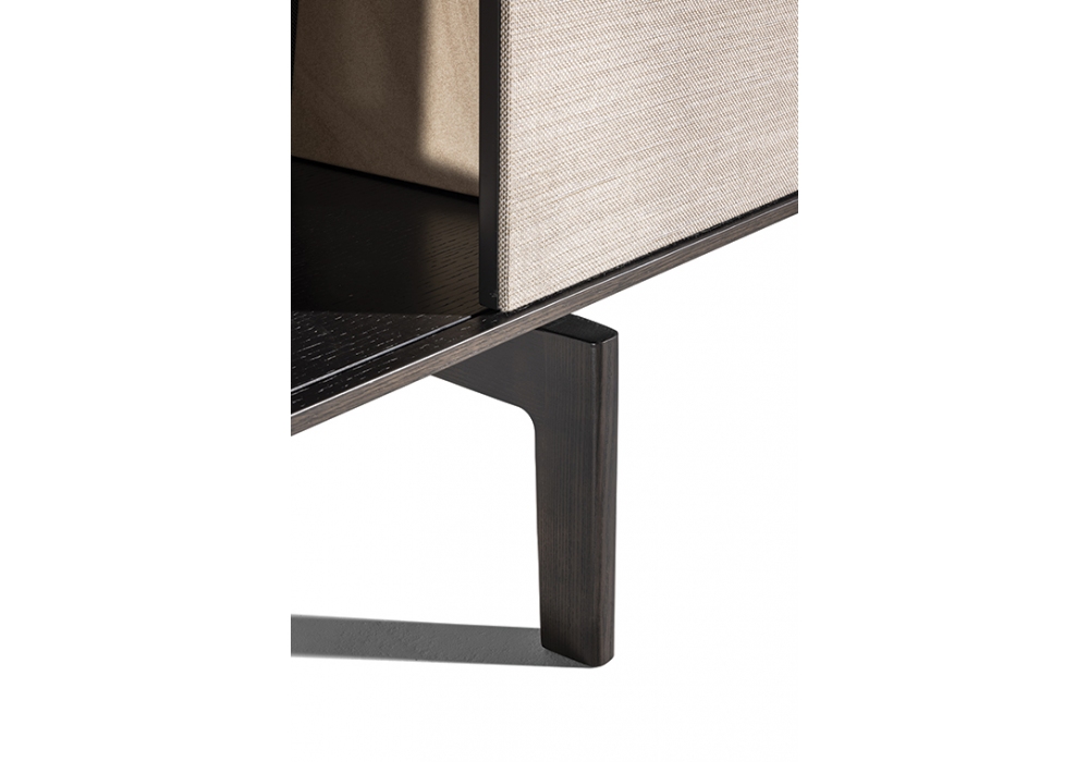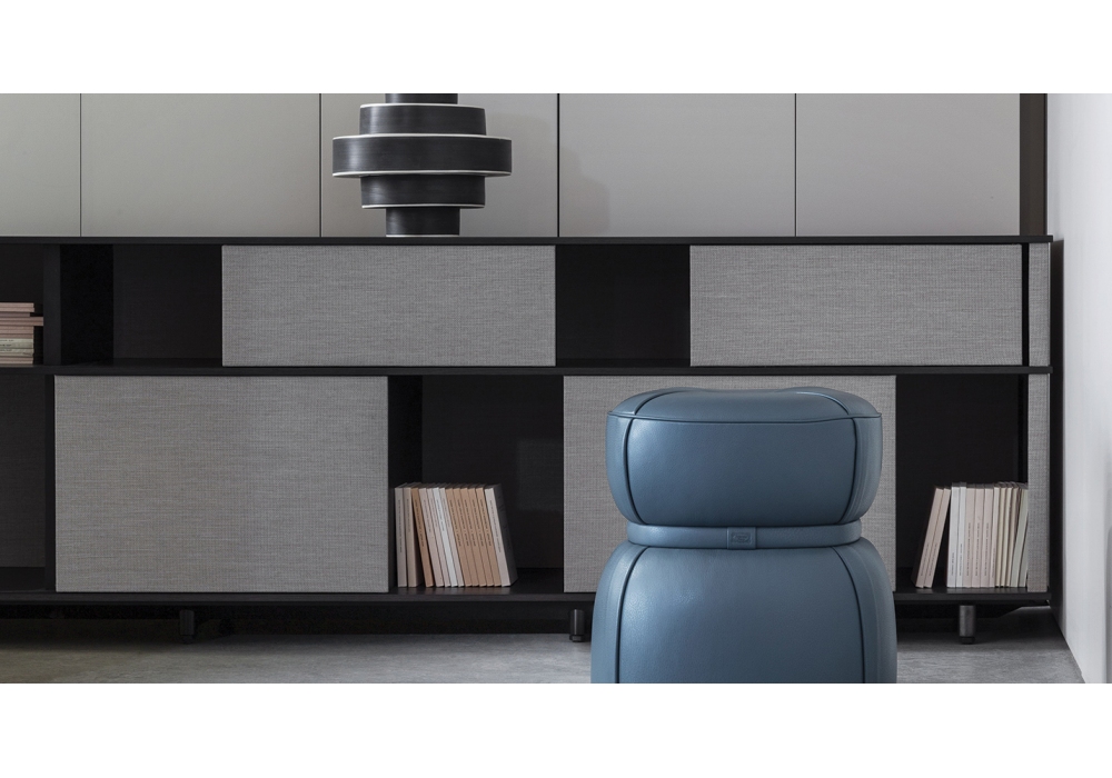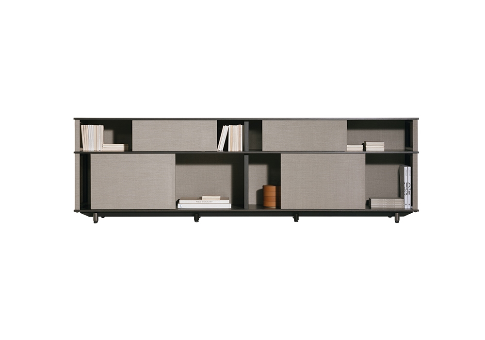Lloyd Tex diseñado por Jean-Marie Massaud para Poltrona Frau es un aparador compuesto por montantes verticales realizados en MDF chapado en roble natural. Los laterales están cerrados por paneles fijos realizados con un marco de madera contrachapada de abedul que están revestidos de tejido técnico. Estantes fabricados en laminado de alta presión en chapa de roble natural. Paneles móviles que se deslizan a lo largo de pistas talladas en los estantes y “patines” de plástico que reducen la fricción entre las superficies. Están fabricados con una estructura de madera contrachapada de abedul recubierta de tejido técnico.