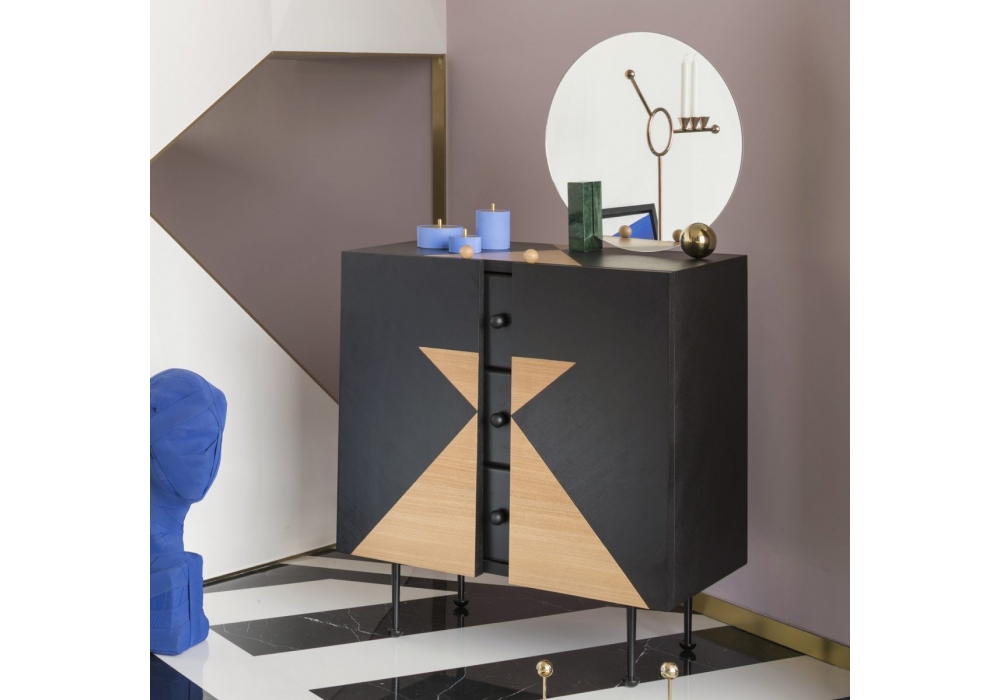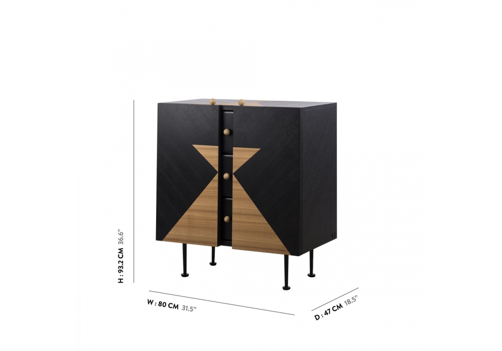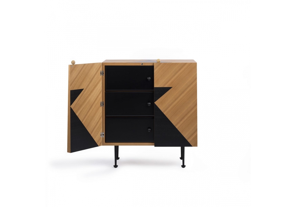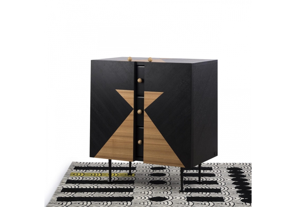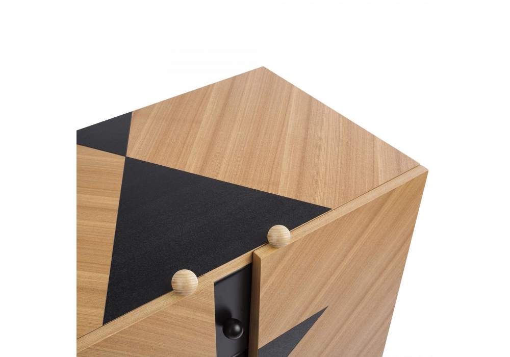 Yin & Yang diseñada por Thomas Dariel para Maison Dada es una cómoda de forma cuadrangular en MDF chapado en fresno natural con partes lacadas en negro. Las patas son de metal con recubrimiento de polvo negro. Yin & Yang están disponibles en dos modelos diferentes.