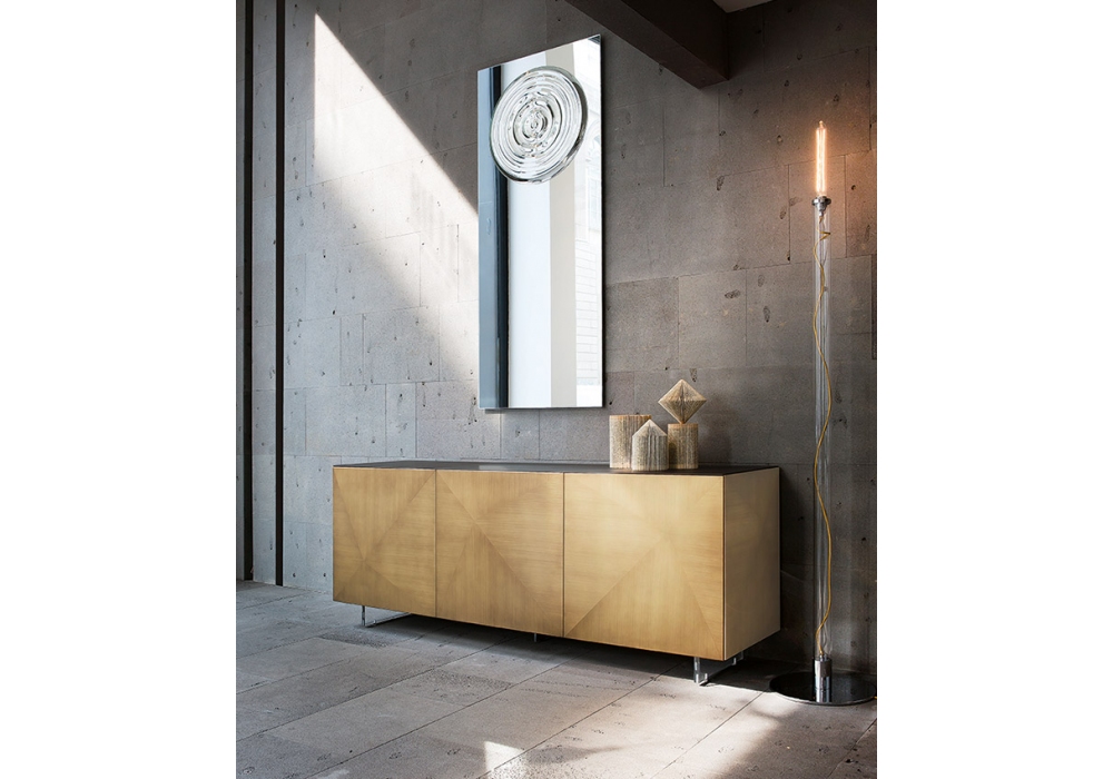 Cubric diseñado por Riflessi es un aparador con puertas y laterales en metal diamantado. Interior y trasera en nogal canaletto. Estantes internos en vidrio transparente. Apertura push-pull. Bajo pedido es posible insertar cajones internos y estantes de madera. Disponible en diferentes medidas y acabados.