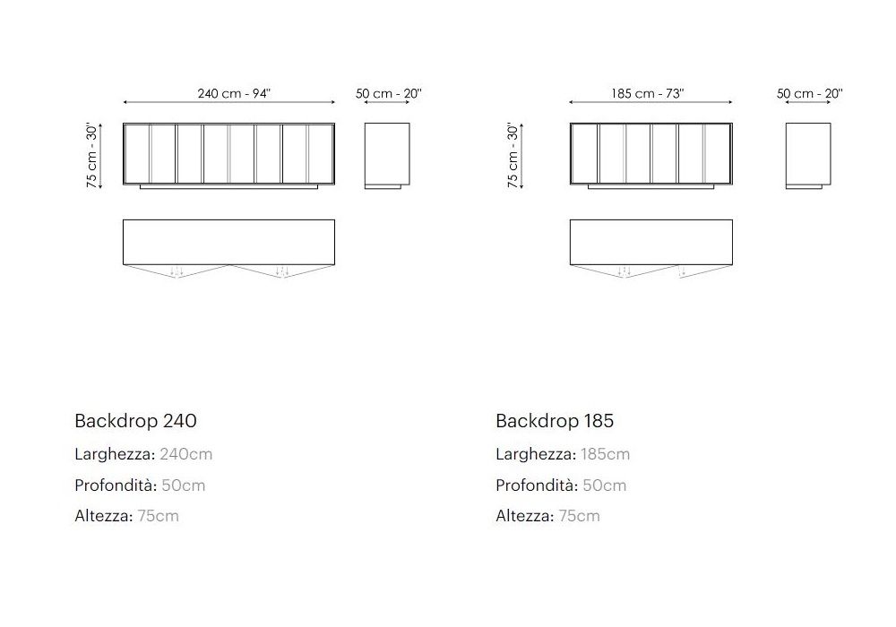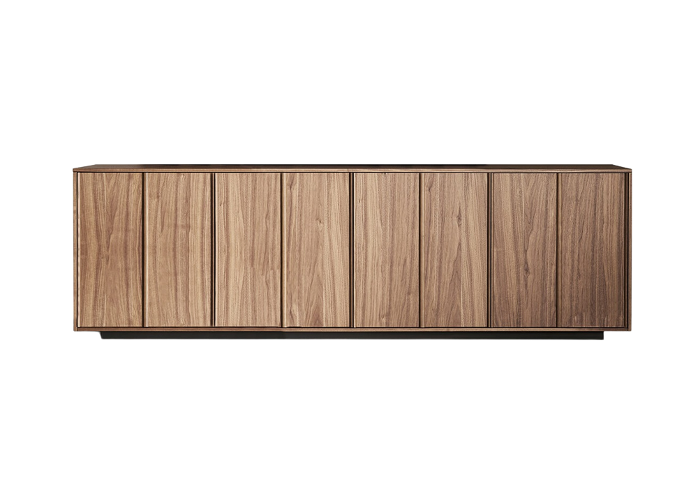 Backdrop diseñado por Alain Gilles para Bonaldo es un aparador disponible en dos tamaños, con estructura en madera chapada en nogal canaletto o en madera lacada color caramelo brillante. La base del zócalo es de metal negro.