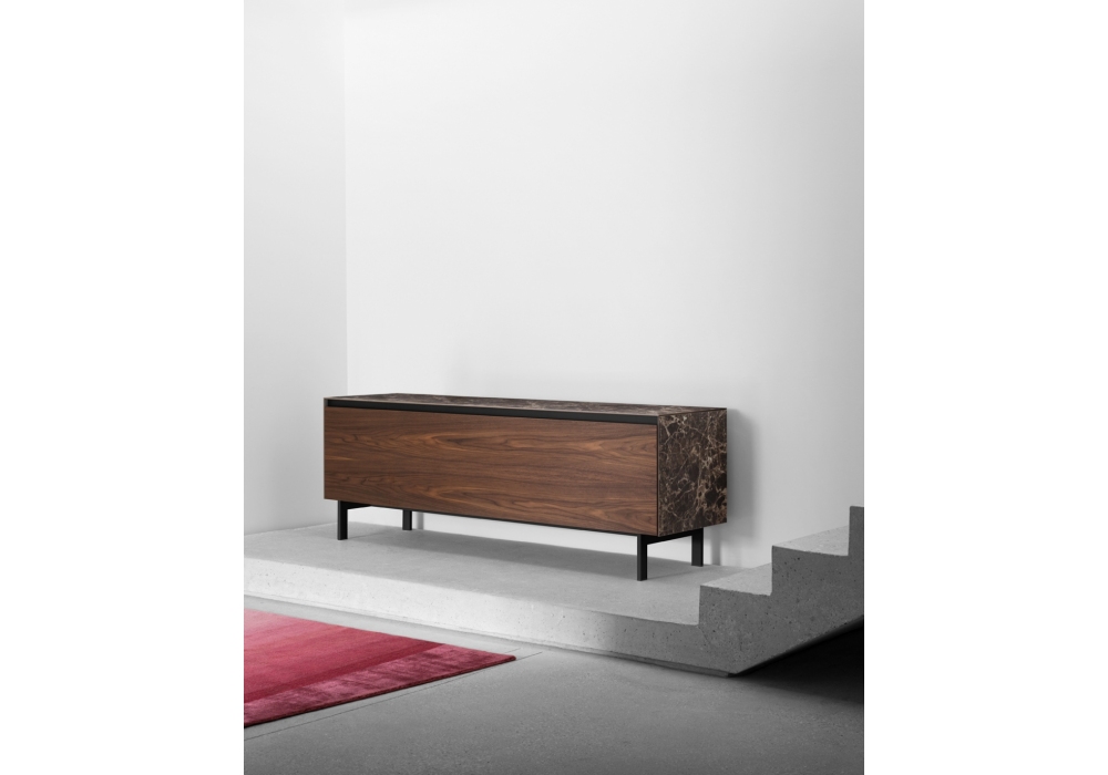 Vitrum diseñado por Andrea Lucatello para Miniforms es un aparador con base y ranura lacados en negro, tapa y costados en vidrio blanco satinado o cerámica extraclara, frente en esencia de madera o cerámica. Disponible en diferentes acabados.
