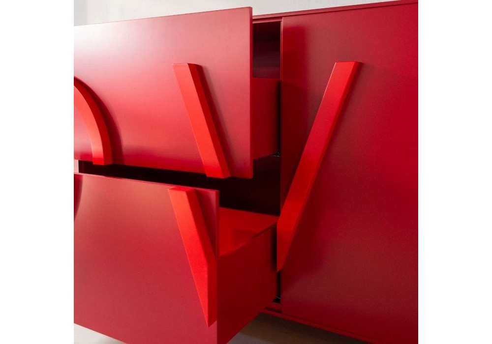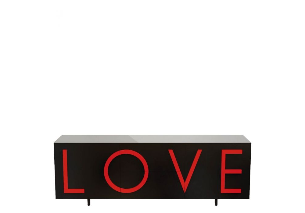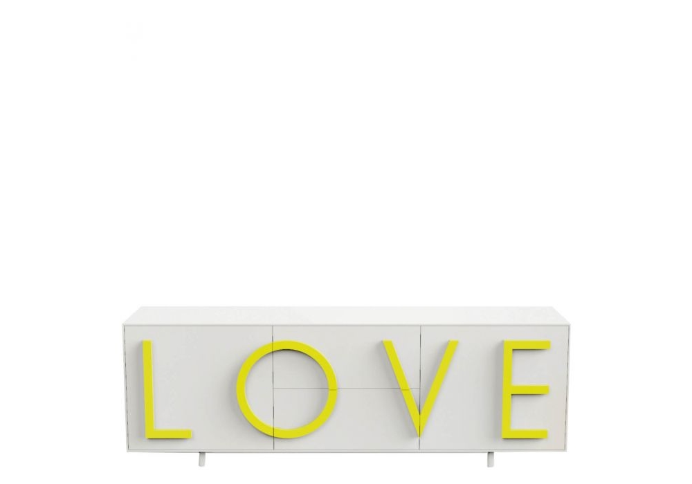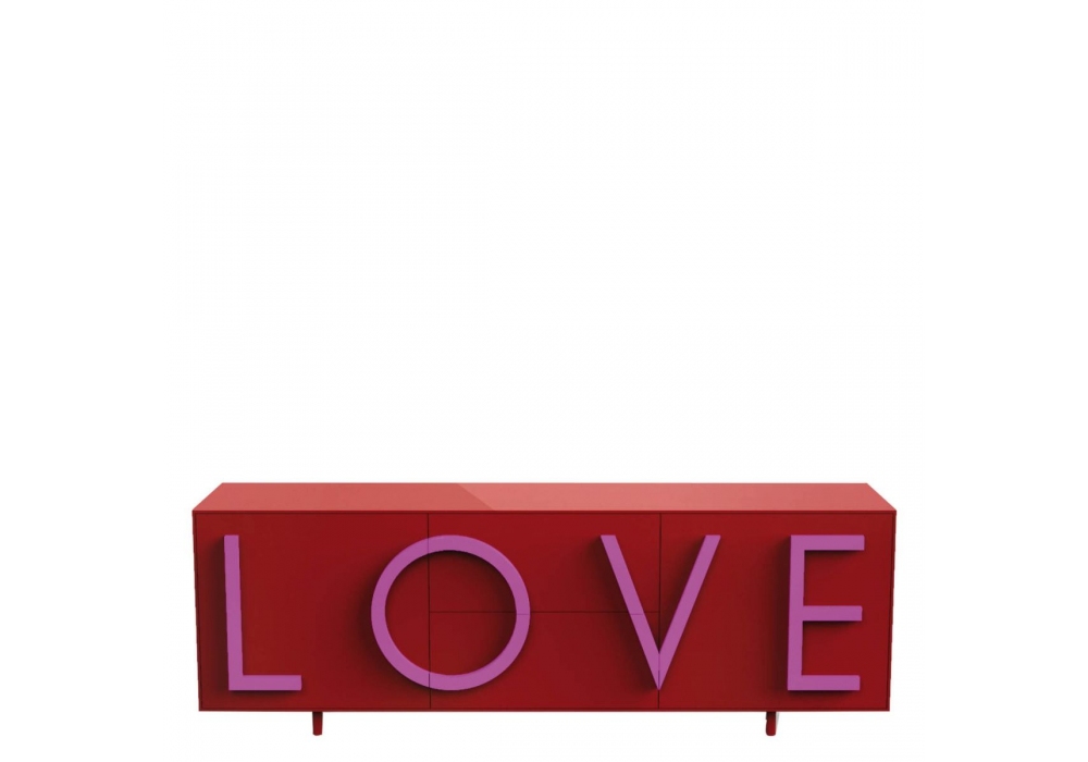Love diseñado por Fabio Novembre para Driade es un aparador con dos puertas laterales batientes y balda interna móvil, con dos cajones centrales de extracción total. Estructura fabricada en MDF lacado exterior e interiormente. Letra LOVE en relieve con función de asa realizada en MDF lacado fácilmente recambiable, personalizando así el envase. Pies cilíndricos regulables de 3,5 cm de diámetro. y altura 10 cm. del mismo color que la estructura. Disponible en versión mediana o grande. Solo para uso interno.