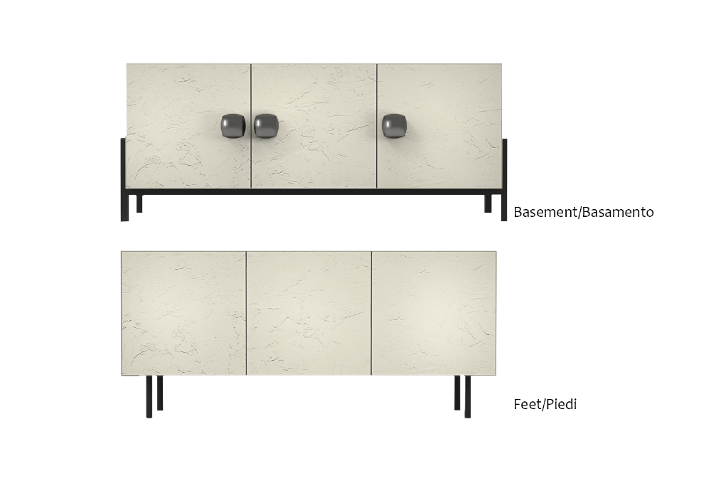 Sharp diseñado por Studio Debonademeo para Momenti es un aparador de 3 o 4 puertas realizado con estructura de mdf, con interior lacado mate. Estructura con borde inclinado 45°. Revestimiento exterior y puertas: lacado mate, mortero lacado mate y mortero moldeado, revestido con tejido de fibra de vidrio impreso, lacado brillante de impresión directa con acabado extrabrillo. Acabado protector: mate atóxico y brillo extrabrillo. Pies o base con estructura metálica en los colores: blanco, negro, bronce y latón. Incluyendo pies niveladores.