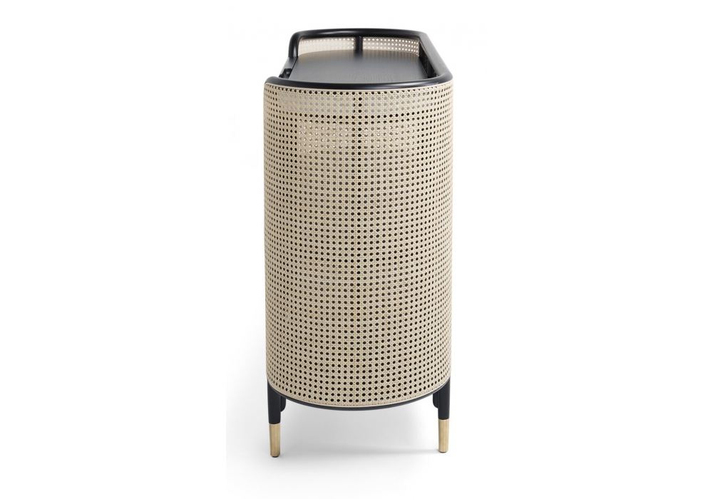 Mos Cabinet diseñado por Gamfratesi para Gebrüder Thonet Vienna es un contenedor con estructura en haya curvada, paneles laterales y traseros en paja de Viena. Estantes de fresno y puntas de latón. Estructura y estantes disponibles en diferentes acabados.