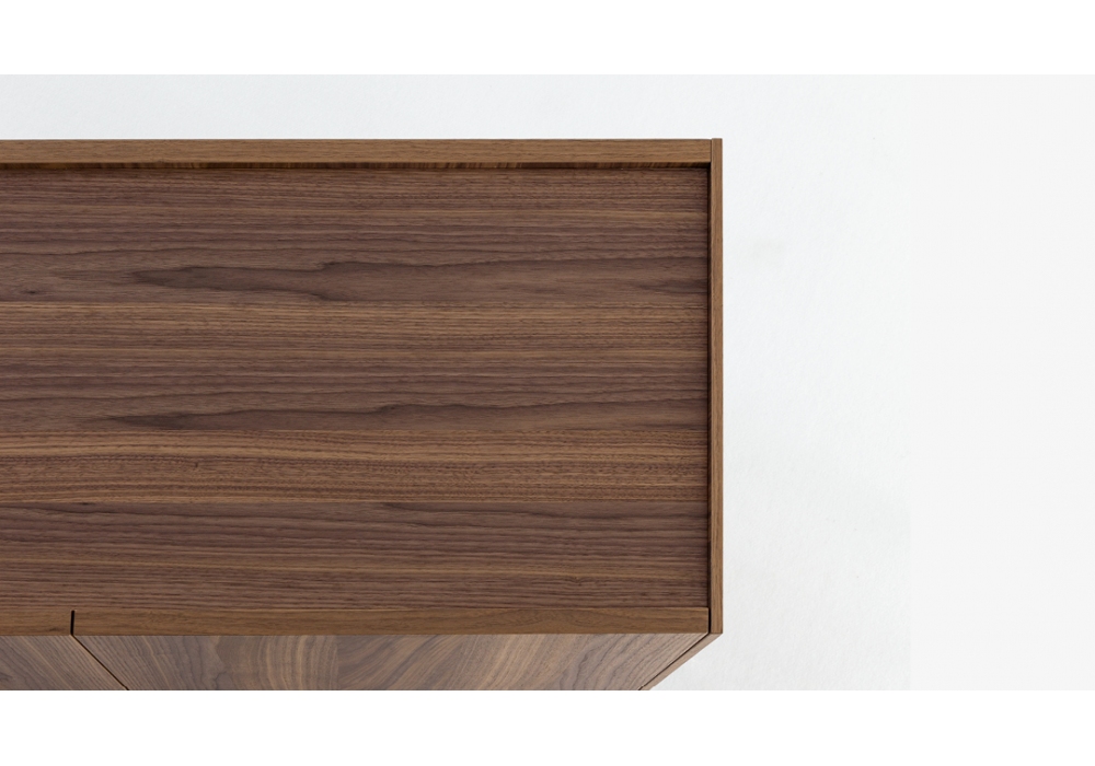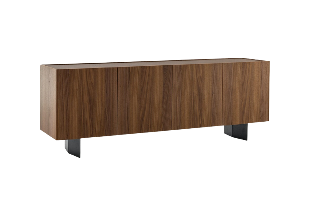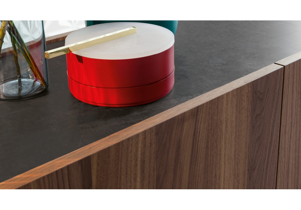 Outline diseñado por Mario Mazzer para Bonaldo es un aparador con estructura en madera chapada en nogal canaletto. La base es de metal pintado en diferentes colores. La tapa está ligeramente empotrada, en nogal canaletto como la estructura o con una tapa adicional de cerámica. Disponible en varios modelos.