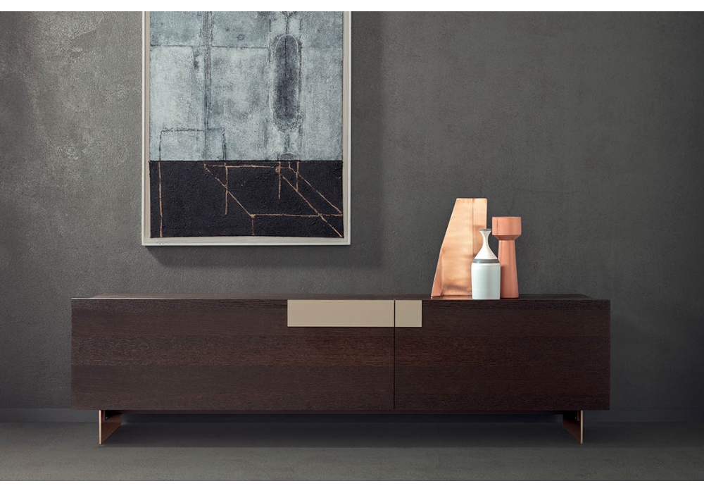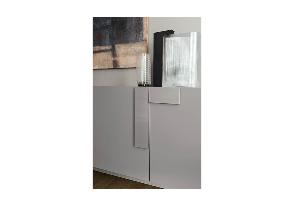 Ginevra diseñado por Pianca es un aparador realizado con esbeltas puertas que sobresalen de la estructura, articuladas sobre bisagras ocultas. Estantes internos de vidrio. Los grandes y expresivos tiradores, cuadrados o rectangulares, se pueden unir para formar composiciones geométricas cambiantes en combinación o en contraste con las puertas. Los acabados lacados, madera o metal también pueden distinguir la base. Disponible en diferentes modelos.