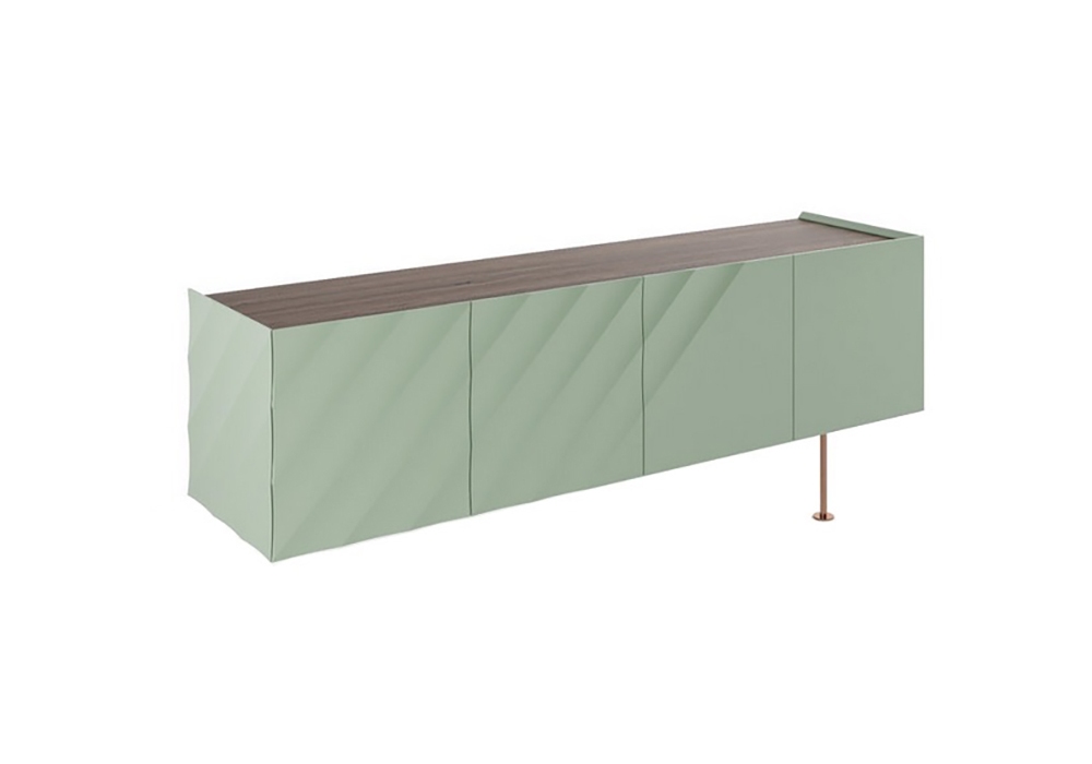 Wave diseñado por Christophe de Sousa para Gual Design es un aparador 4 o 3 con repisa interna de vidrio presente en cada módulo. Estructura verde azulado lacado mate, tapa de nogal y pies de acero inoxidable con acabado en color cobre. Es posible añadir el cajón como accesorio. Disponible en diferentes dimensiones.