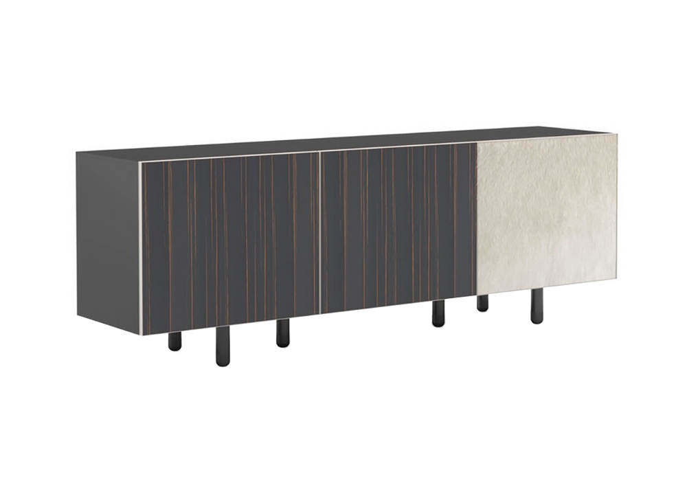 Reaves diseñado por Gualter Torres para Gual Design es un aparador con 3 o 2 puertas en chapa de ébano, una de ellas en tejido Furry Polar. Cada compartimento está equipado con un estante de vidrio interno. El cajón interior se puede añadir como accesorio. Pies en hierro pintado de negro. Disponible en diferentes acabados y dimensiones.