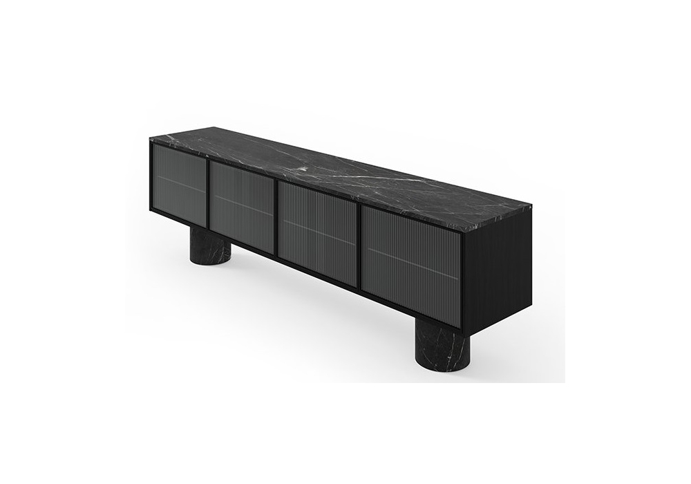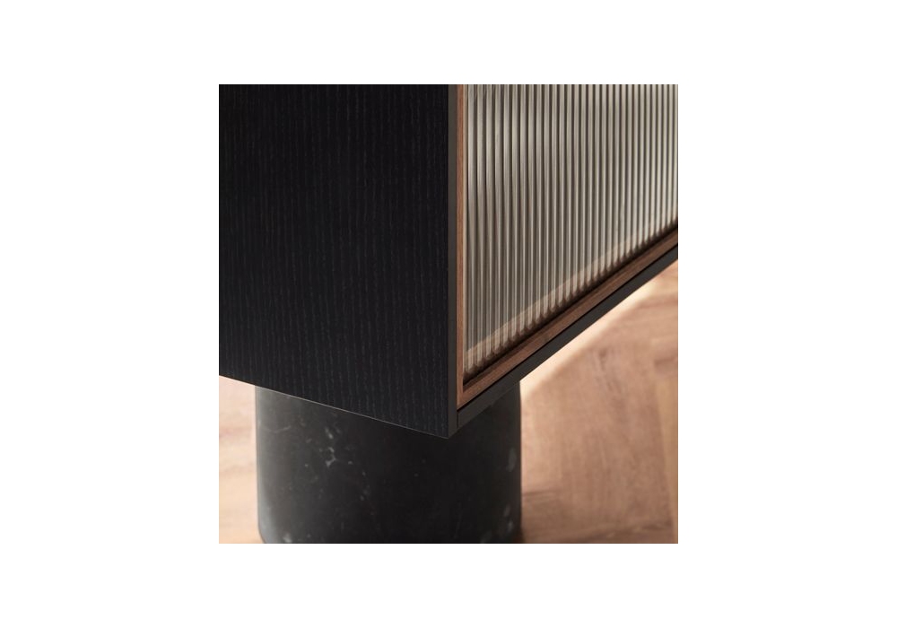 Rio diseñado por Sebastian Herkner para Punt es un aparador con estructura de MDF chapado en roble o nogal, sobre y pies/base en madera o mármol Marquina. Puertas batientes sin tiradores de madera maciza de roble o nogal y cristal templado ondulado. Cada módulo incluye un estante interior en cristal templado con fijación en el centro.
