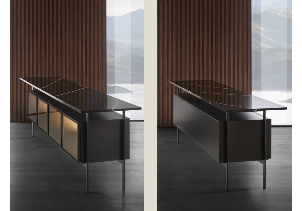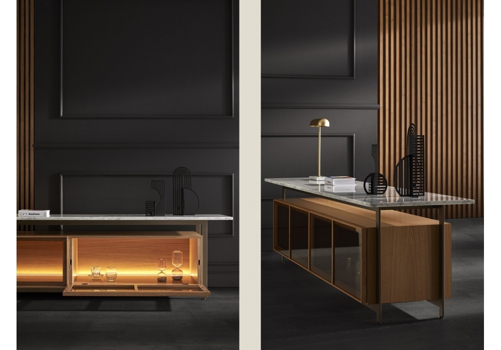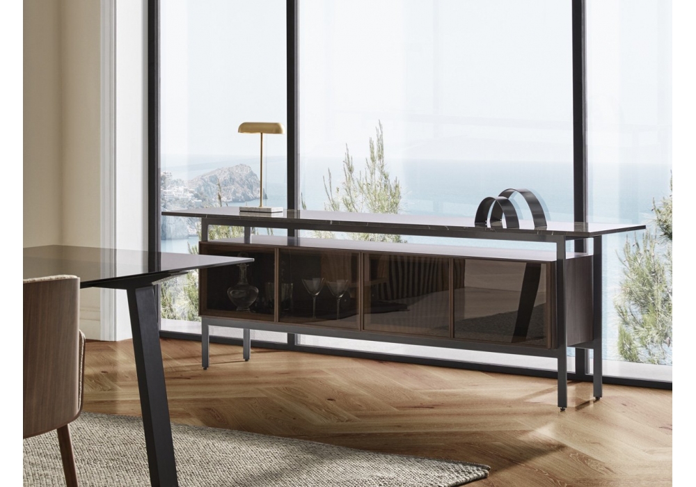 Chicago Glass diseñado por Norm Architects para Punt es un aparador con estructura en MDF chapado en roble o nogal, estructura metálica en acero termolacado y tapa en chapado en mármol o nogal. Puertas de cristal. Disponible en la versión con LED integrado; La iluminación interna se puede encender/apagar cuando se abre/cierra una puerta o se puede activar con el movimiento del pie en la parte inferior del marco metálico.