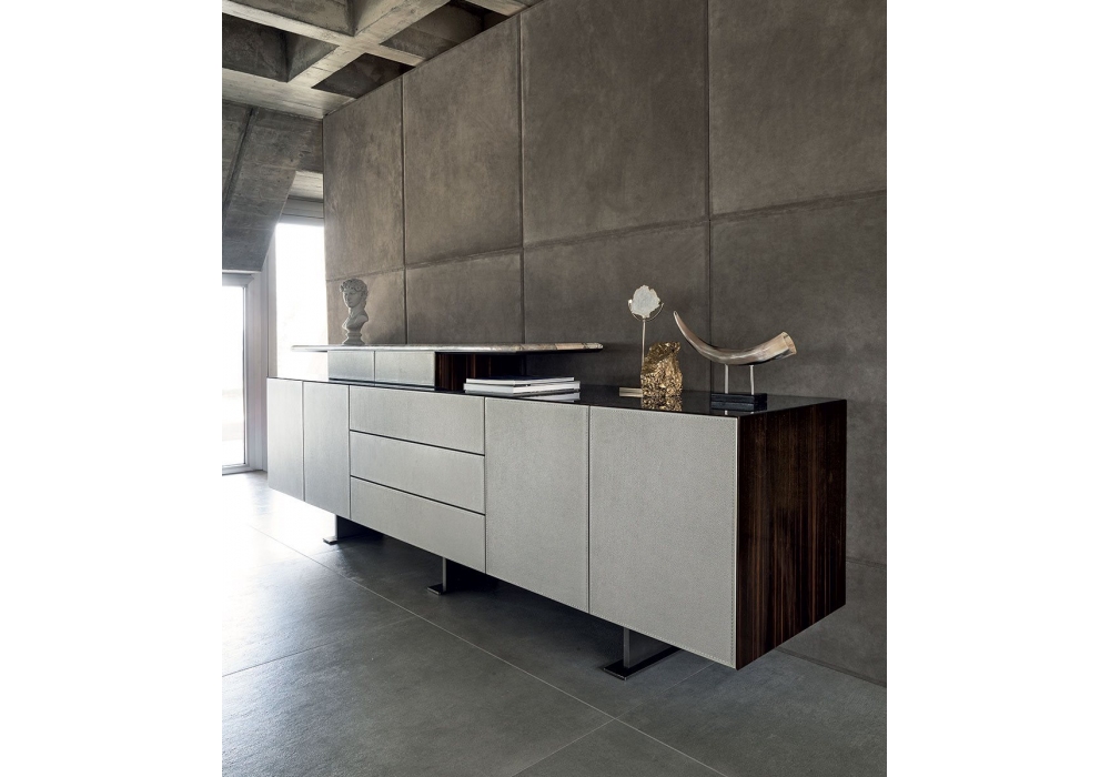 Neptune diseñado por Giuseppe Viganò para Longhi es un aparador en dos alturas con estructura de madera en esencia o lacado brillo y tapa apoyada sobre dos cajoncitos realizados en mármol o espejo. Puertas delanteras tapizadas en piel e interiores lacados bronce mate. Apertura push-pull. Base de aluminio pintado bronce. Disponible en diferentes dimensiones.