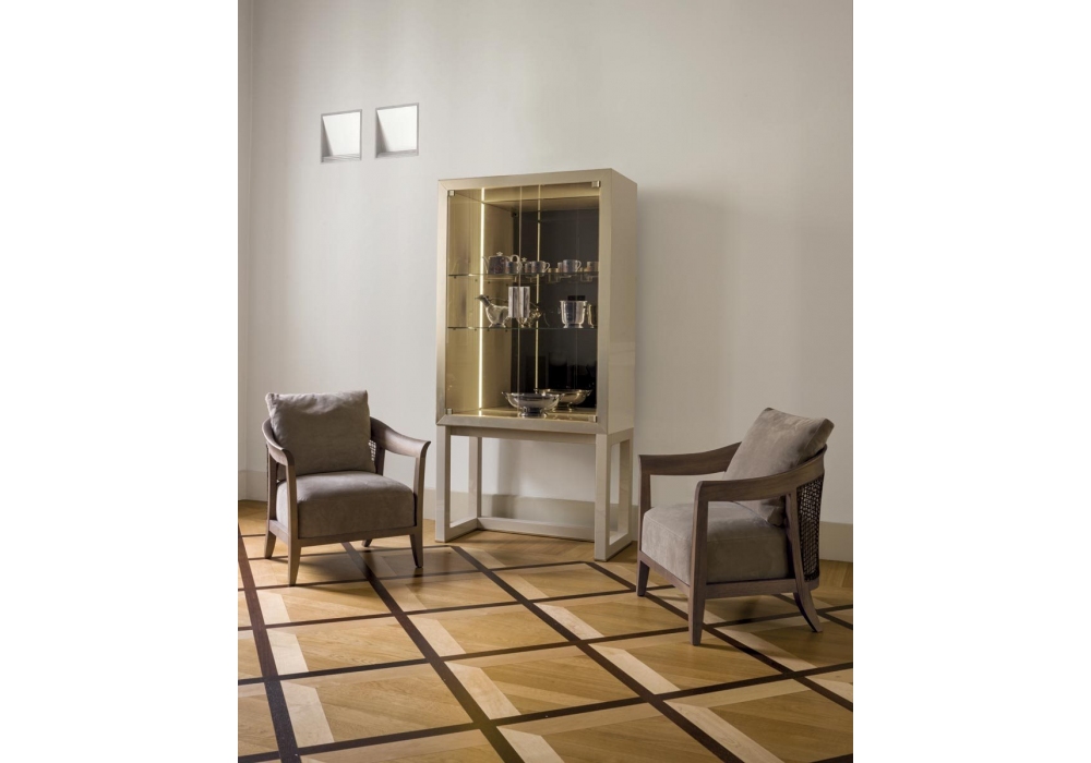 Orwell diseñada por Giuseppe Viganò para Longhi es una vitrina con base y marco en metal rectificado, estructura en madera lacada en esencia o brillante y puertas frontales en bronce o vidrio ahumado con dos estantes internos en vidrio transparente. Mangos de mármol. En los laterales del respaldo hay dos tiras de LED regulables con encendido táctil, que iluminan el interior del mueble.