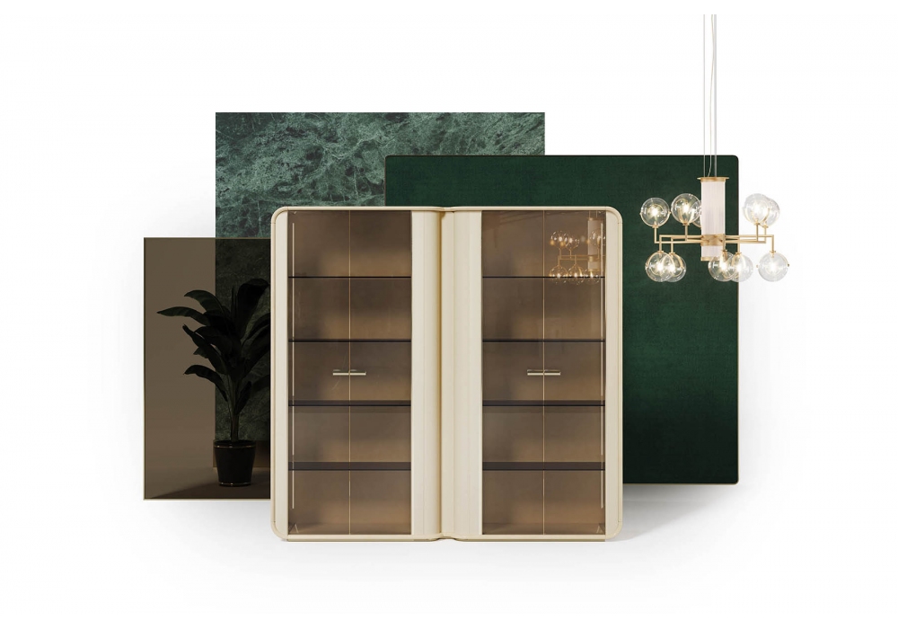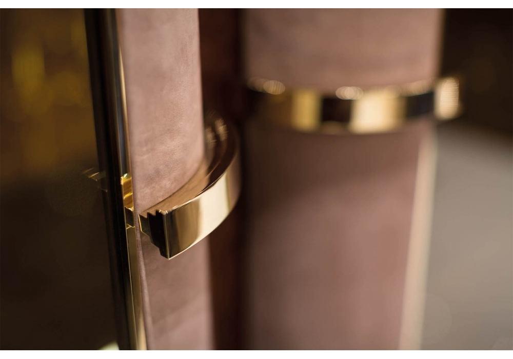 Madison diseñada por Andrea Bonini para Turri es una vitrina con estructura en MDF y paneles de aglomerado en acabado lacado brillo. Hay dos puertas de vidrio bronceado con inserciones de cuero con un pilar central de mármol, madera lacada brillante o cuero. Disponible en dos dimensiones.