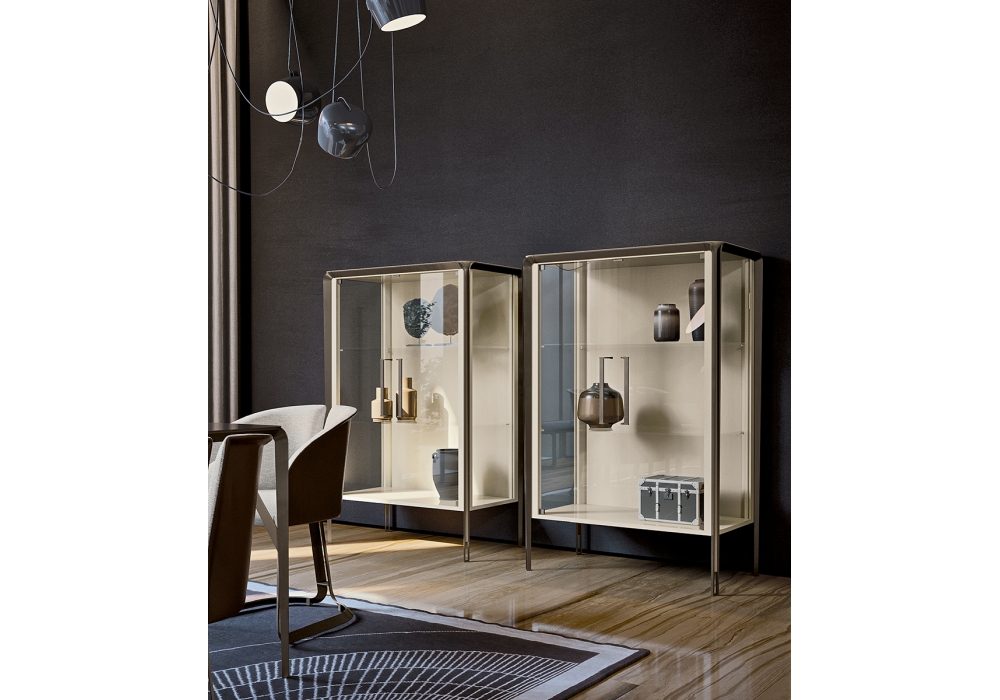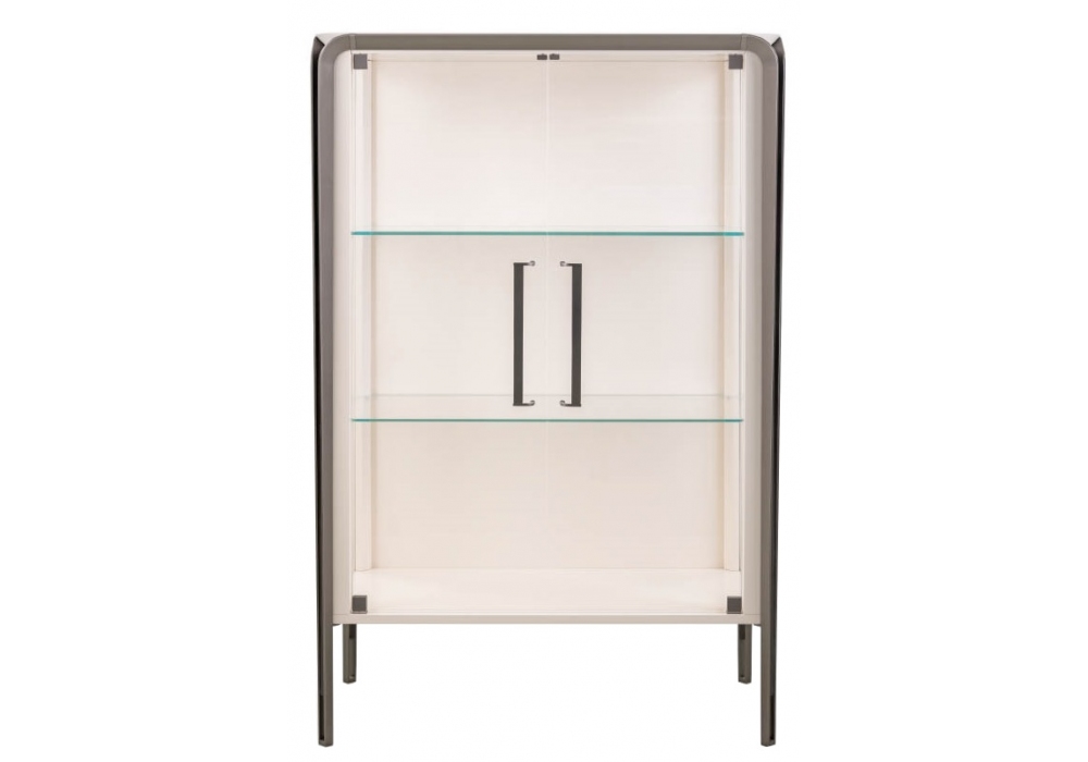 Milano diseñada por Blengini Ghirardelli para Turri es una vitrina con estructura en MDF y madera maciza en acabado poliéster lacado brillo con paneles laterales en cristal. Patas de metal níquel cepillado curvado con inserciones de piel. En el interior hay dos puertas de cristal.