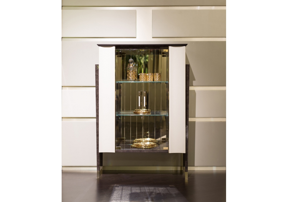 Noir diseñada por Andrea Bonini para Turri es una vitrina con estructura en MDF y paneles de aglomerado con acabado poliéster brillante decorado a mano. En el interior hay dos compartimentos laterales con cuatro baldas de cristal y un compartimento central con dos baldas de cristal con paredes de espejo bronceado. Partes metálicas en acabado oro claro o bronce.