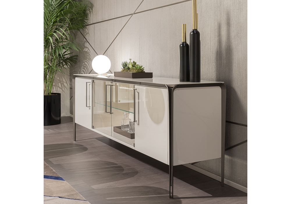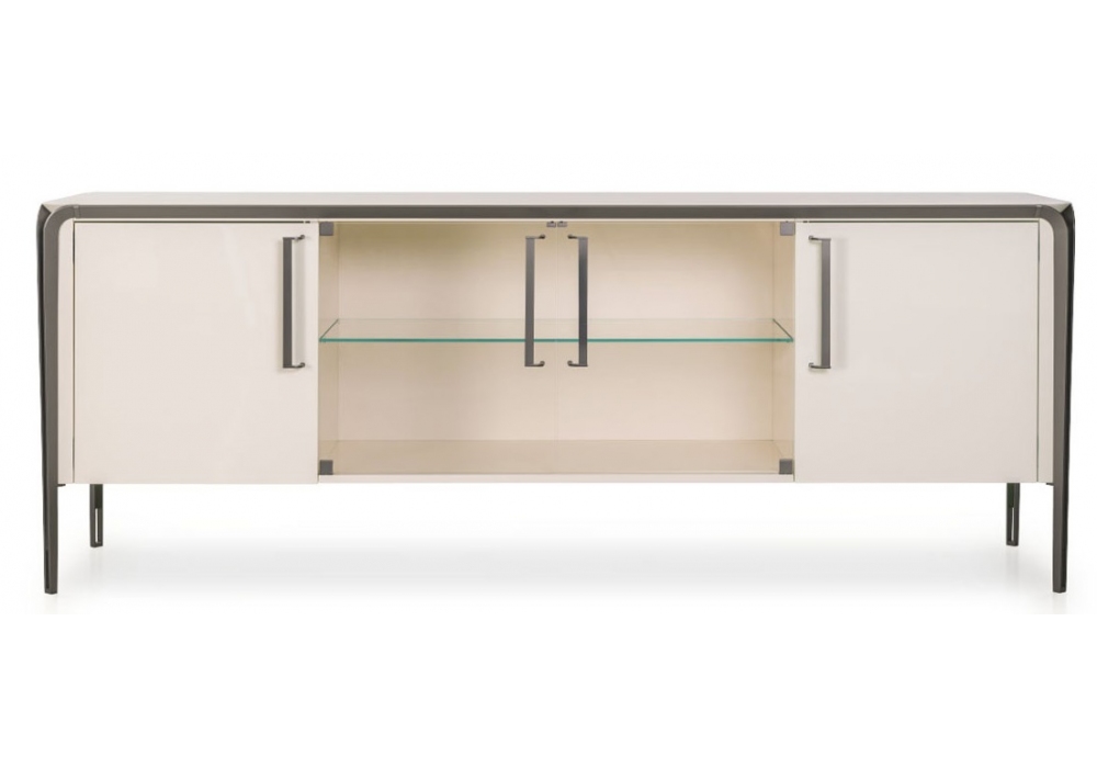Milano diseñado por Blengini Ghirardelli para Turri es un aparador con estructura de MDF en acabado lacado brillante con patas curvas de metal con inserciones de cuero. Tiene dos compartimentos con balda de madera y un compartimento con balda de cristal. Hay dos puertas de cristal y dos lacadas en brillo.