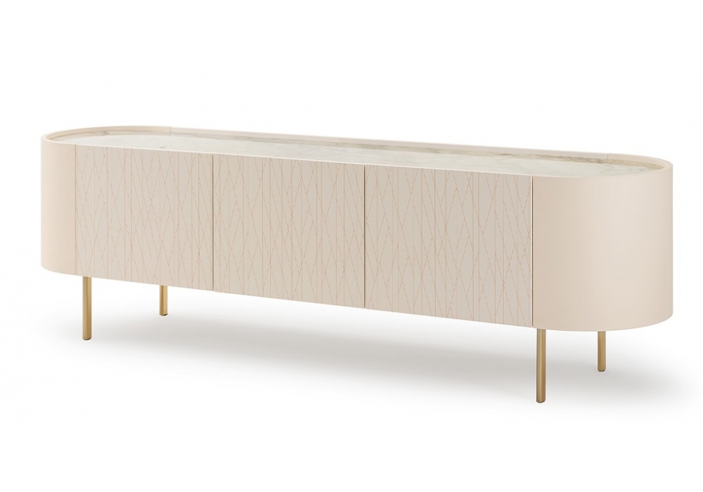 Roma diseñado por Monica Armani para Turri es un aparador con estructura en MDF y contrachapado lacado brillante con estructura lateral revestida en piel. El sobre puede ser de piel o mármol y las patas son de metal en dos acabados. Disponible en la versión con puertas con o sin decoración. Bajo pedido puertas de vidrio.