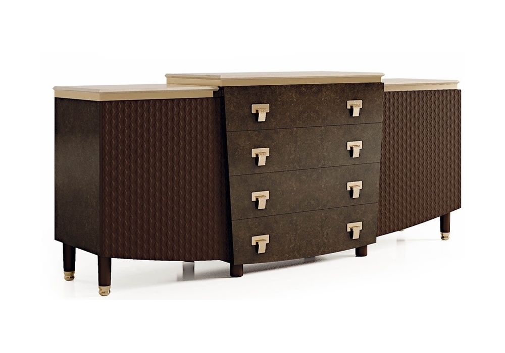 Vogue diseñado por Andrea Bonini para Turri es un aparador con estructura en MDF, madera contrachapada y paneles de partículas en acabado lacado brillante. Tapa en mármol o madera. Hay dos puertas revestidas en piel bordada con un motivo hexagonal en el exterior y lisa en el interior. Los dos compartimentos internos están equipados con dos estantes de vidrio.