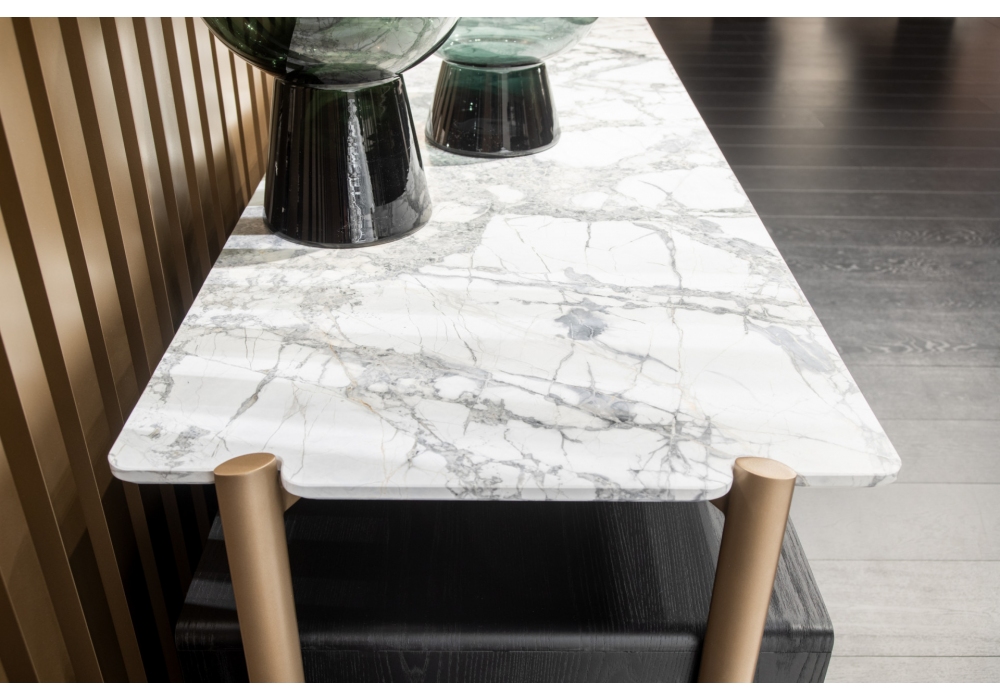 Eros diseñado por Studio 63 para MisuraEmme es un aparador caracterizado por una estructura de metal bronce que sostiene el contenedor de roble negro y la tapa de mármol. Disponible en dos dimensiones.
