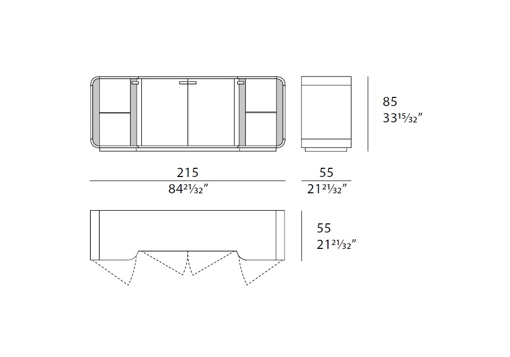 Madison diseñado por Andrea Bonini para Turri es un aparador con estructura de MDF y paneles de tableros de partículas chapados con acabado brillante. Dos puertas son de cristal bronceado con inserciones de piel y dos de madera con acabado lacado brillo. En el interior hay dos compartimentos laterales con balda de cristal bronceado y un compartimento central con balda lacada brillo. Es posible añadir un set de iluminación led con o sin sensor.