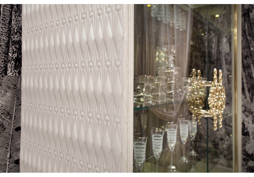 Numero Tre diseñada por Roberto Serio para Turri es una vitrina con estructura en MDF, madera maciza, paneles multicapa y aglomerado en acabado lacado brillo con respaldo total o parcialmente tapizado en piel bordada. En el interior hay un compartimento con paredes de espejo bronceado con tres estantes de vidrio. Disponible en diferentes dimensiones.