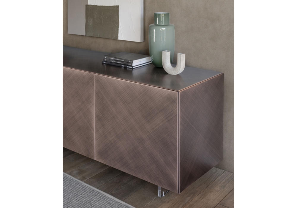 Essential firmado por reflections es un aparador realizado en madera lacada en acabado Tiben cepillado a mano con efecto rayado y cruzado. En el interior hay unos estantes de cristal transparente. Las aberturas son push-pull. Bajo pedido es posible insertar cajones internos.