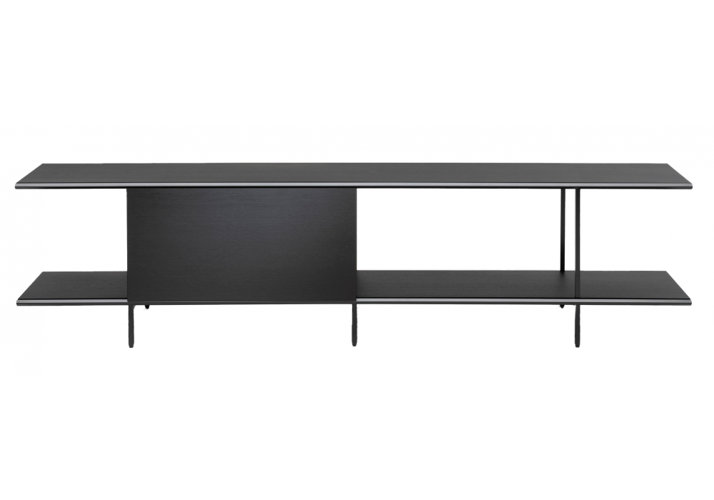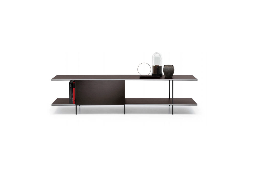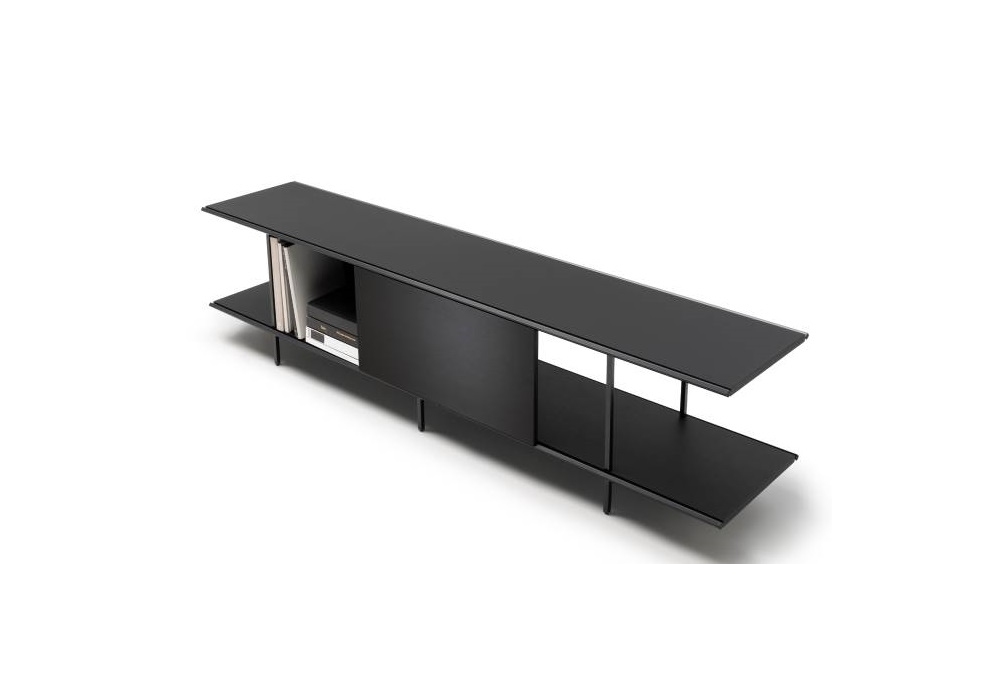 Railway diseñado por Giacomo Moor para Living Divani es un mueble contenedor con guías y patas en acero pintado Anodik negro, estantes de nido de abeja con estructura de abeto macizo y nido de abeja interno y hombros y respaldo de panel de madera. Puertas de entrada exteriores en madera contrachapada o lacada brillo. Disponible en dos dimensiones.
