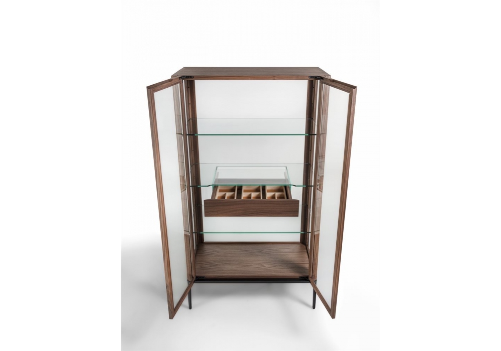 Atsuko diseñada por D. Dolcini para Porada es una vitrina con estructura en nogal canaletta macizo, cristales transparentes y base en metal negro mate. Cajón interior en nogal canaletta con guías en arce natural. En el interior del cajón hay dos bandejas de arce natural con fondo revestido de Cuoietto. Iluminación LED integrada regulable mediante mando a distancia o APP.