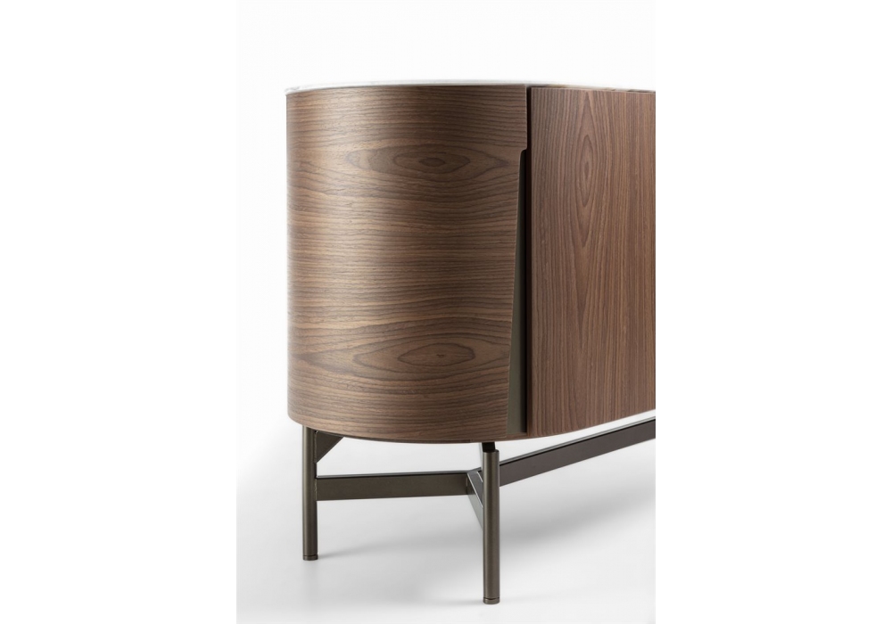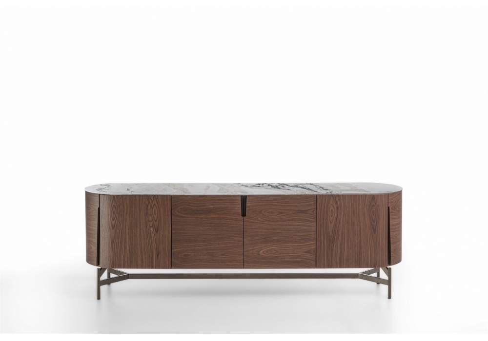Tylsa 240 diseñado por D. Radice para Porada es un aparador con tres compartimentos y cuatro puertas batientes con estructura en fresno o nogal canaletta. Tiradores de empotrar con base metálica en acabado Bronzoro. Base de metal en acabado Bronzoro y tapa de madera o mármol. Estantes internos en vidrio transparente.