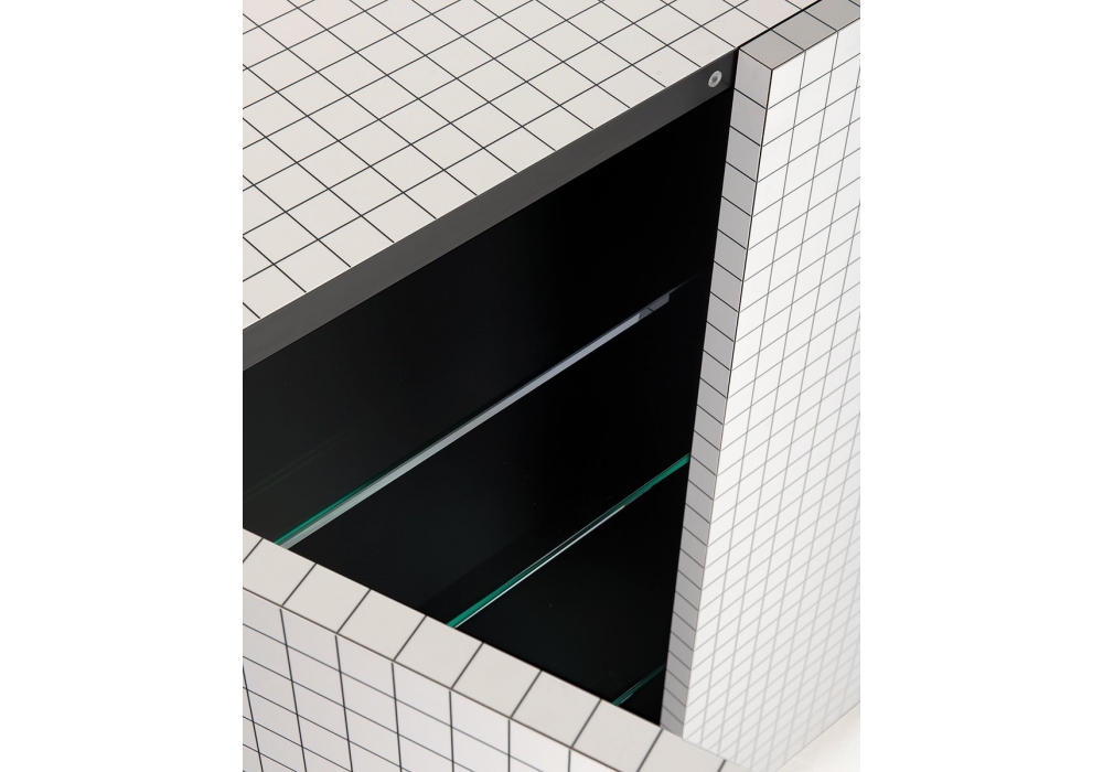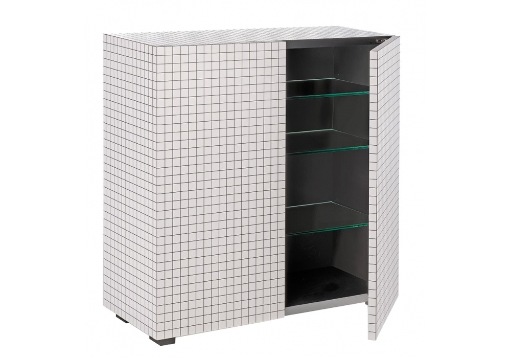 757 Quaderna diseñado por Superstudio para Zanotta es un aparador con estructura de madera revestida con laminado Print, color blanco, con impresión digital cuadriculada en negro. Revestimiento interno en laminado negro y estantes internos ajustables en vidrio templado.