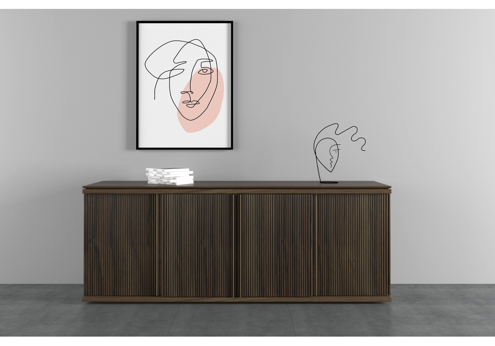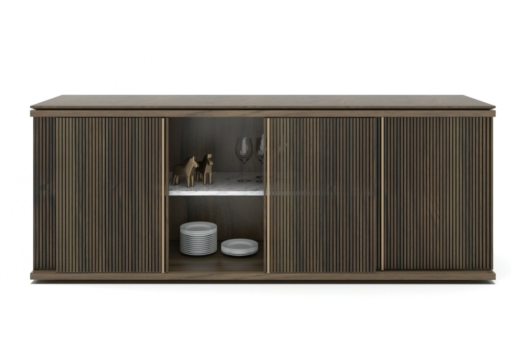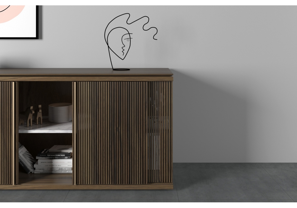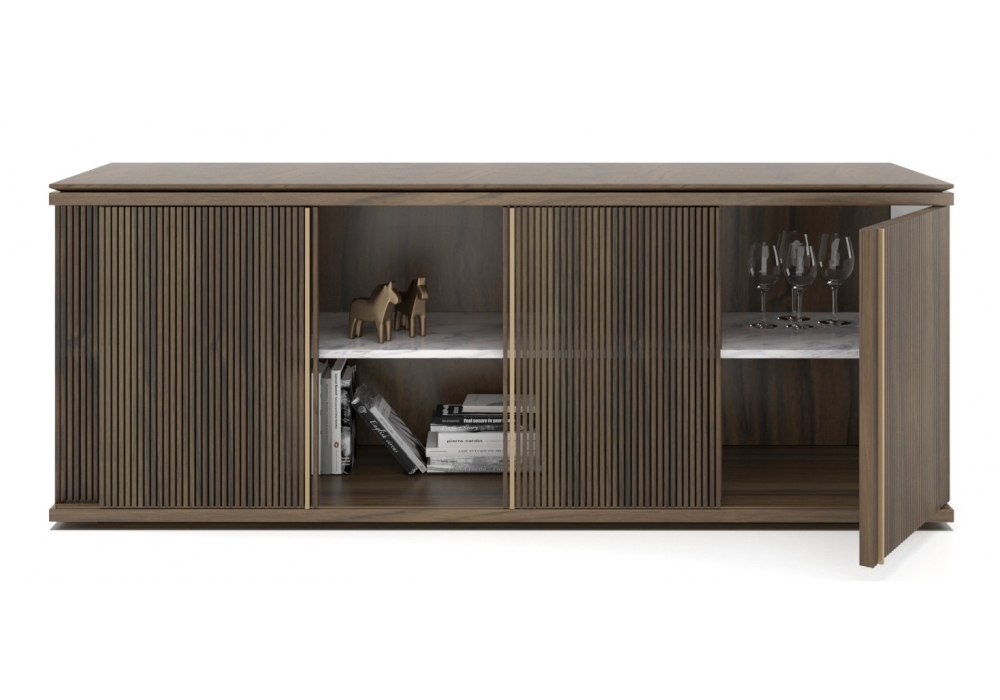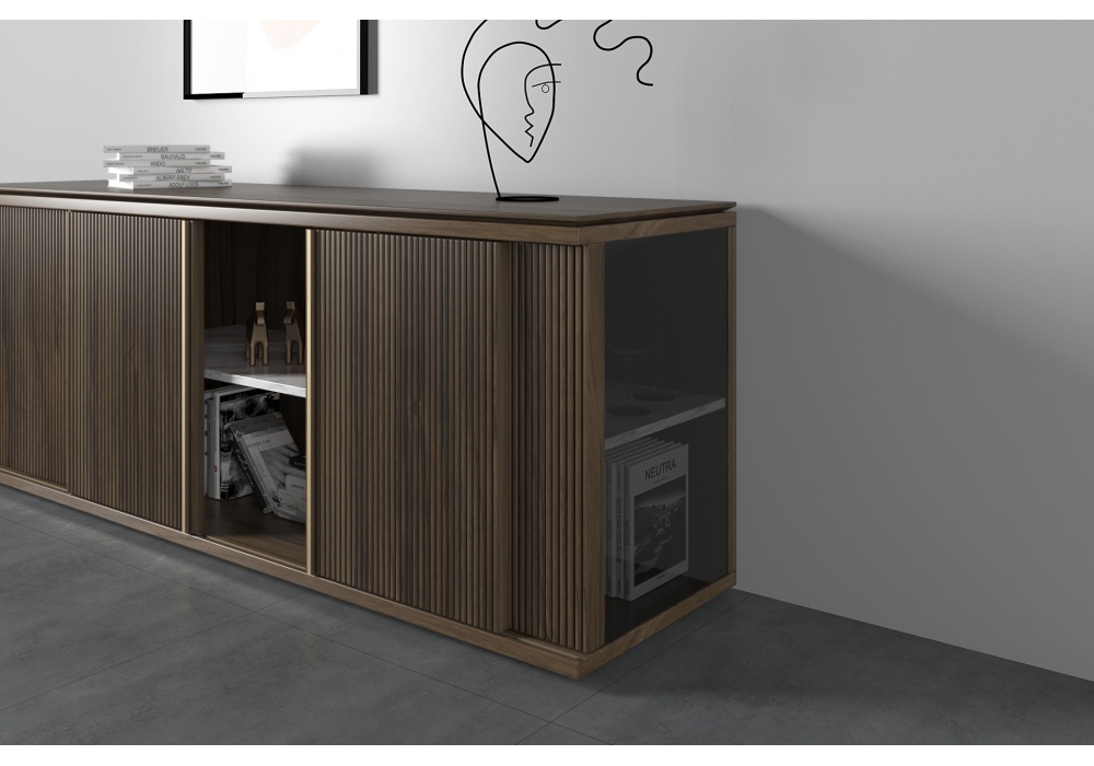 Erica diseñado por Serra By Milia para Escooh es un aparador con estructura de madera maciza, lados laterales en cristal y estantes internos en mármol o madera. La tapa está realizada en nogal o mármol. Disponible en la versión con puertas batientes o correderas.