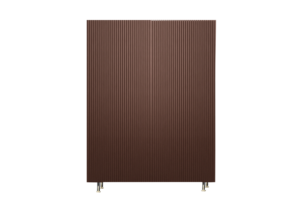 Aero diseñado por Alessio Bassan para Capodopera es un meuble contenedor caracterizado por una base de metal negro con pies ajustables en latón pulido y estructura en diferentes acabados con un patrón ondulado vertical. Las puertas tienen bisagras y hay 2 compartimentos internos con 2 estantes de vidrio móviles.